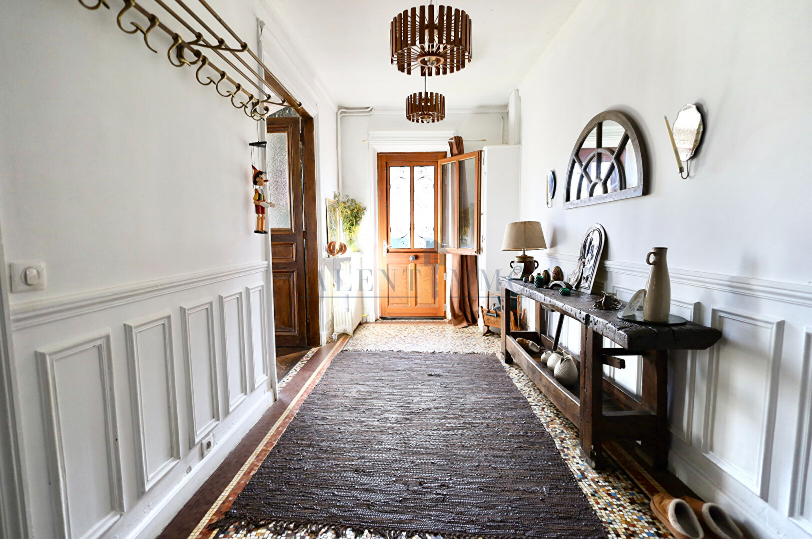 au RDC : belle Entrée avec mosaique d'époque, Séjour spacieux avec beau parquet en point de Hongrie et cheminée d'époque en marbre, grande Cuisine séparée dinatoire avec accès terrasse.