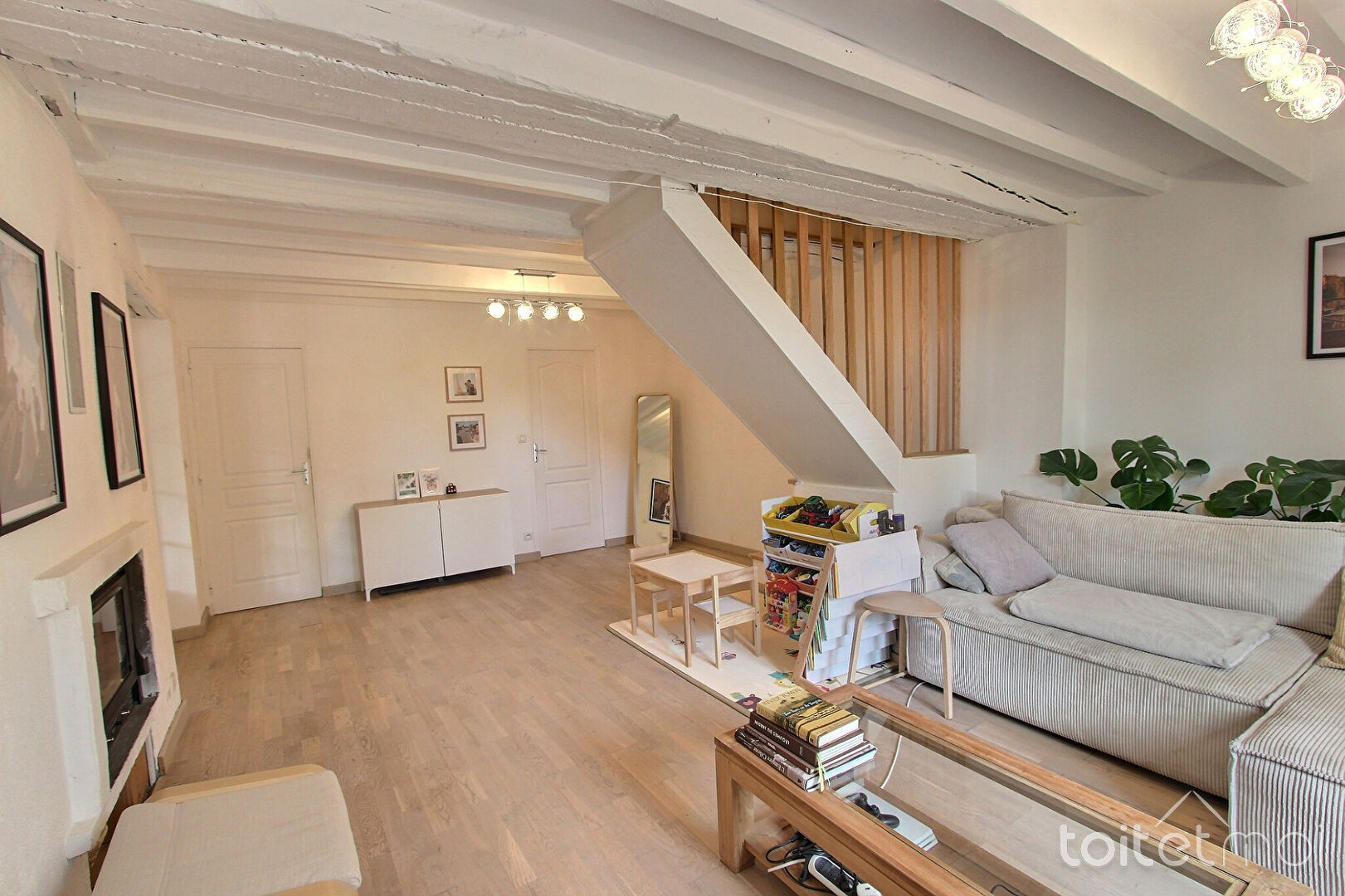 Elle comprend au rez-de-chaussée une cuisine dinatoire aménagée et équipée, un séjour avec cheminée à insert, une salle de bains et des toilettes. Les pièces de vie sont exposées plein sud.