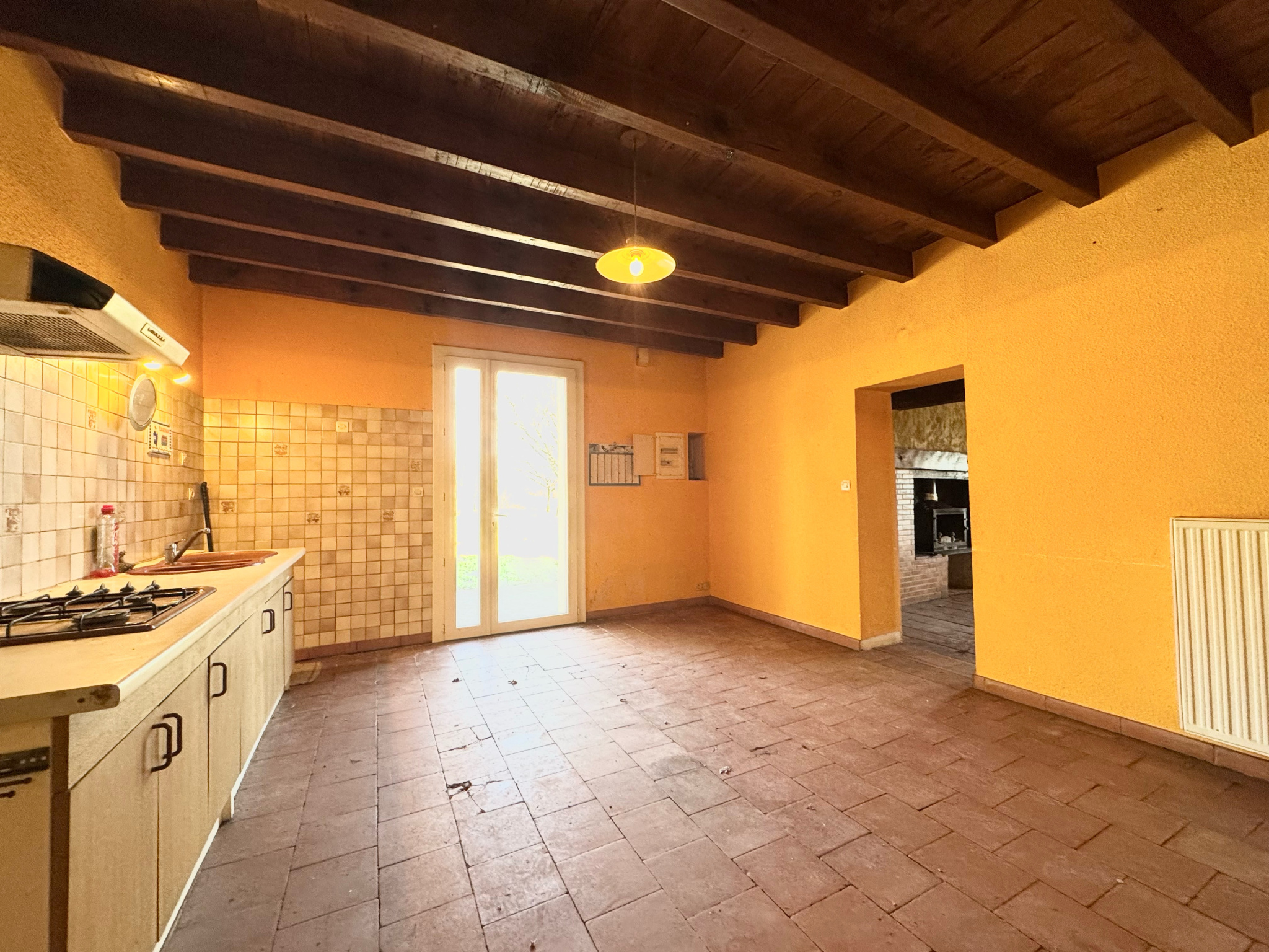 Cette ancienne ferme développe environ 111 m2 habitables. L'entrée s'ouvre sur une vaste cuisine de plus de 20 m2, conviviale et fonctionnelle, ainsi qu'un séjour chaleureux agrémenté d'une cheminée ancienne et de tomettes, apportant authenticité et cachet. La maison comprend également trois chambres, une salle de bain, des toilettes séparées et un cellier, offrant un agencement pratique et confortable.