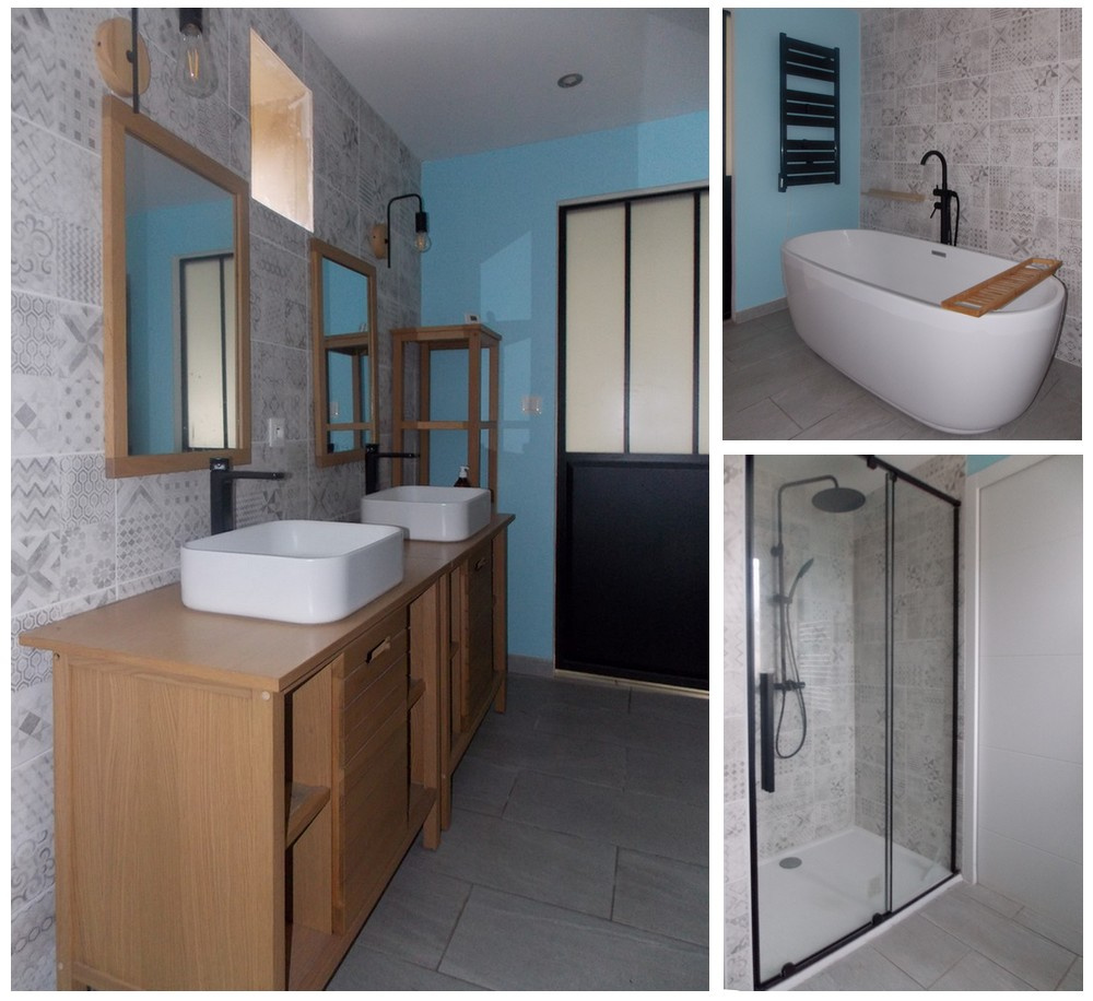 Une salle de bain principale spacieuse (8 m2) équipée d'une baignoire, d'une douche à l'italienne et d'une double vasque.