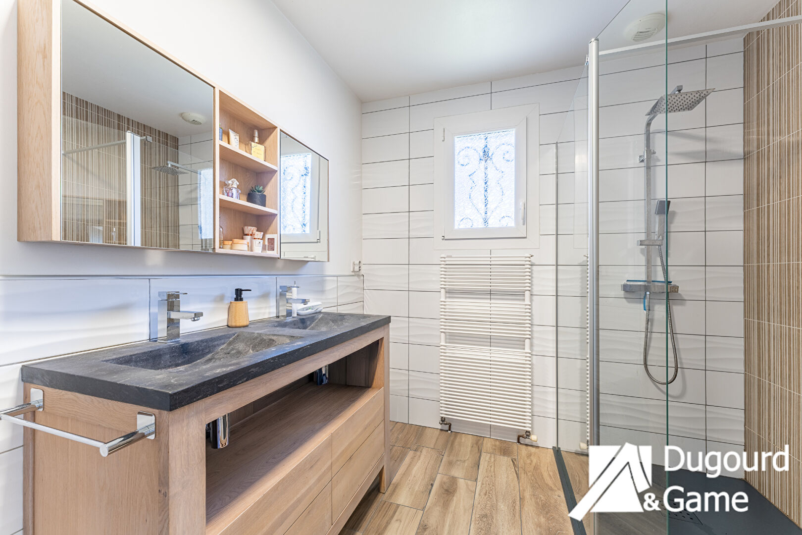 L'étage principal, d'environ 105 m², propose une belle pièce de vie lumineuse avec cuisine neuve ouverte, offrant un espace convivial et moderne. L'espace nuit se compose de trois chambres confortables, d'une salle d'eau entièrement refaite avec des prestations actuelles, ainsi que d'un WC séparé.