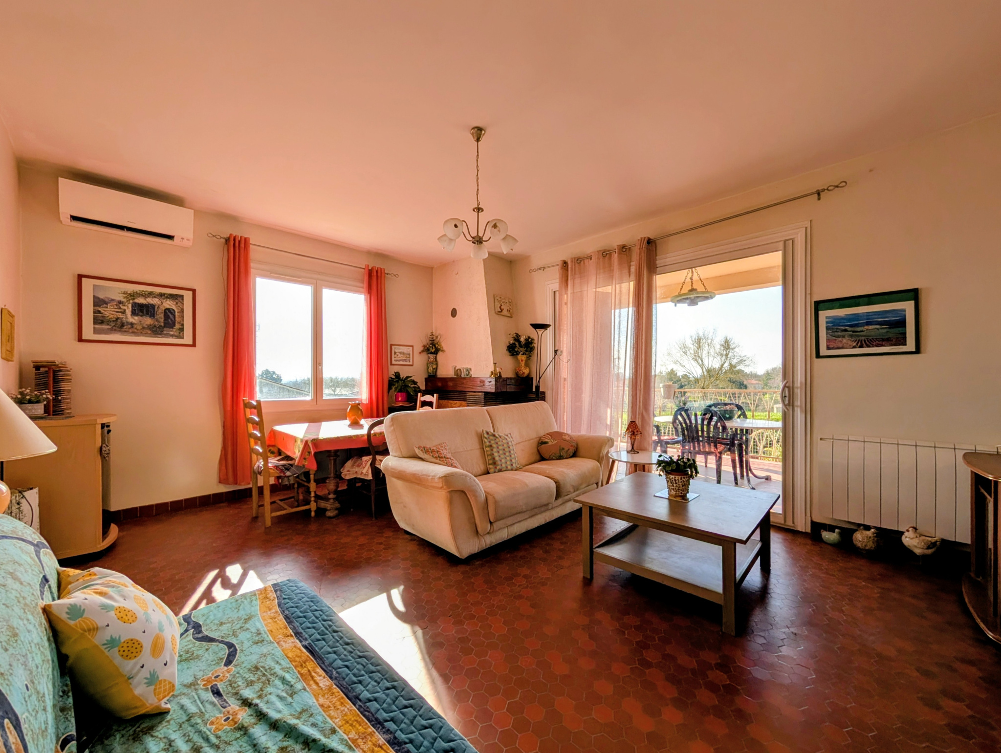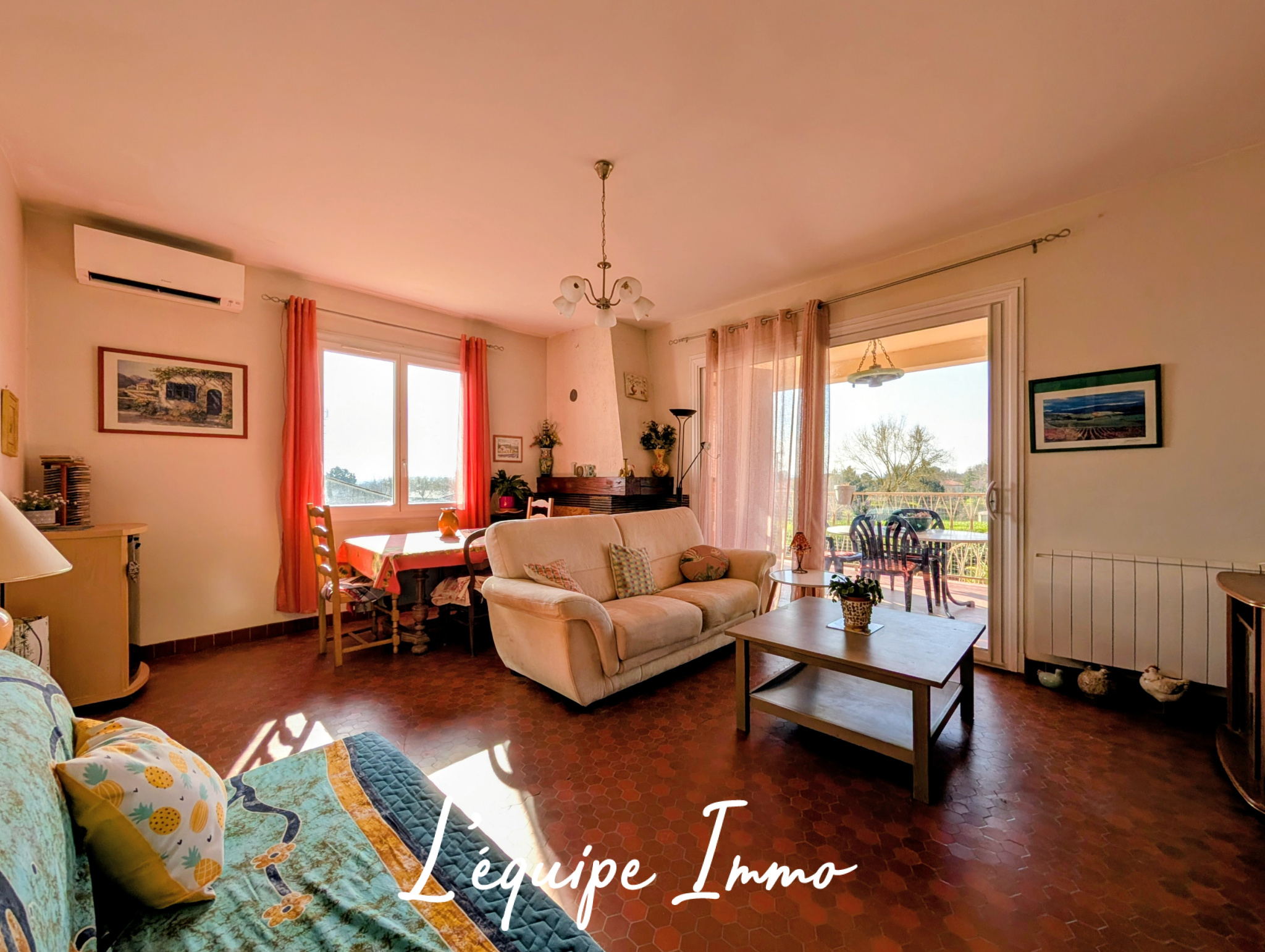 À l'étage, la partie habitable d'environ 88 m2 comprend une cuisine indépendante, un salon-séjour lumineux avec cheminée ouvrant sur une grande terrasse offrant une vue sur les Pyrénées, ainsi que deux chambres, une salle de bains et des WC séparés.