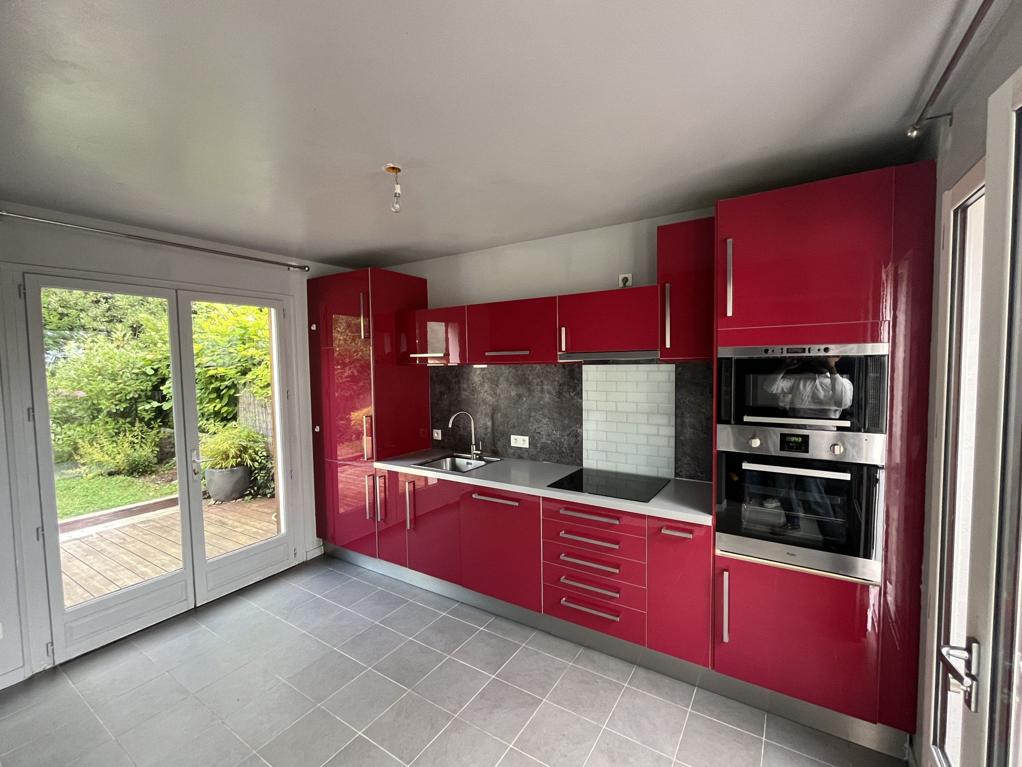 Cuisine équipée moderne ouvrant par porte-fenêtres sur 2 terrasses