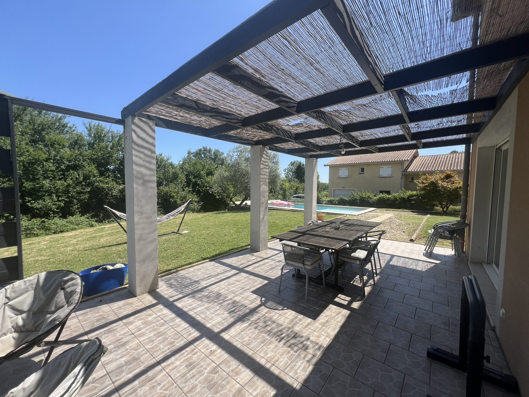 Terrasse carrelée avec pergola.