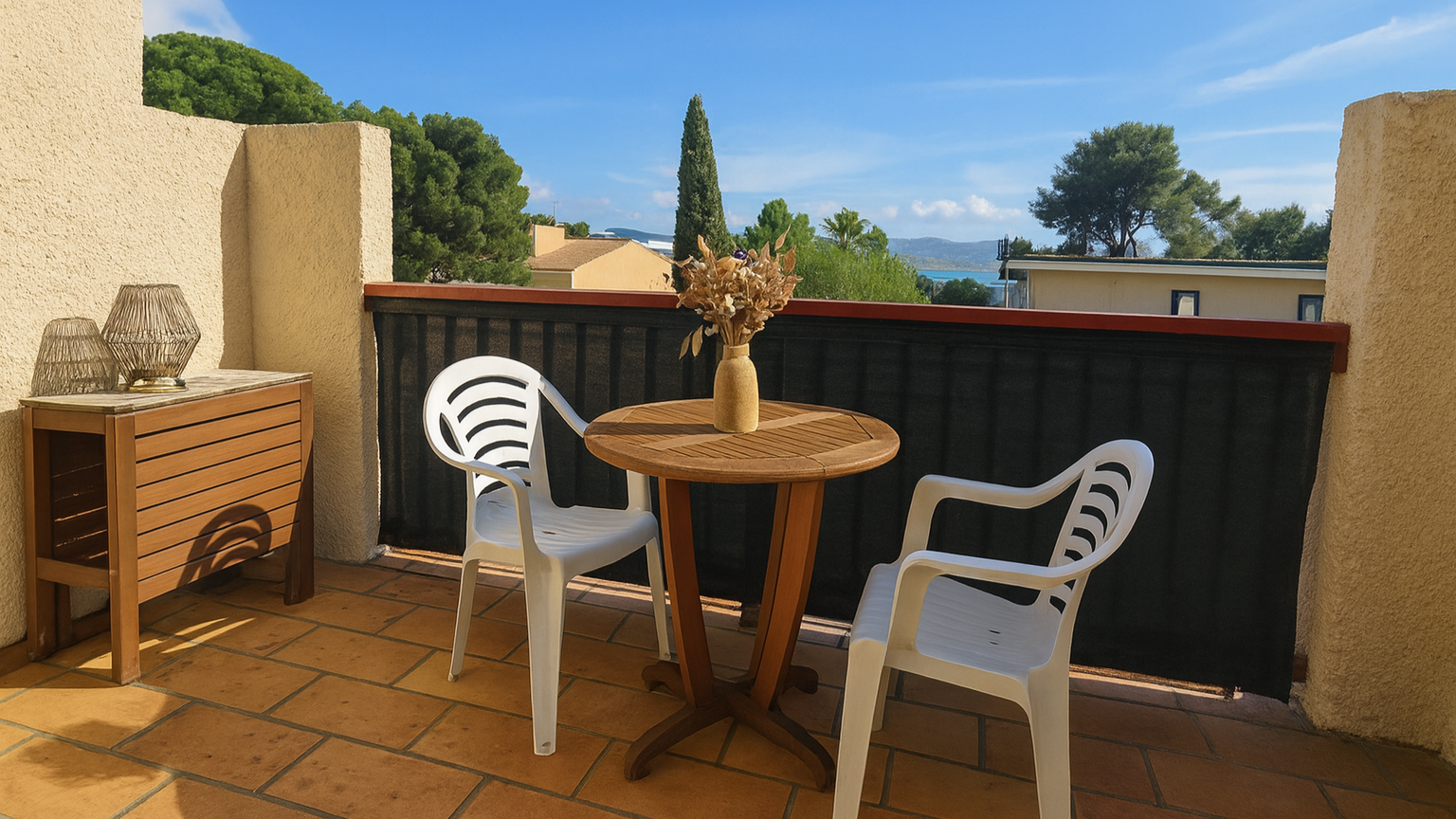Il se compose d'une entrée avec placard, d'une agréable pièce de vie avec cuisine ouverte donnant sur une terrasse plein Sud avec vue mer, ainsi que d'une salle d'eau avec WC.