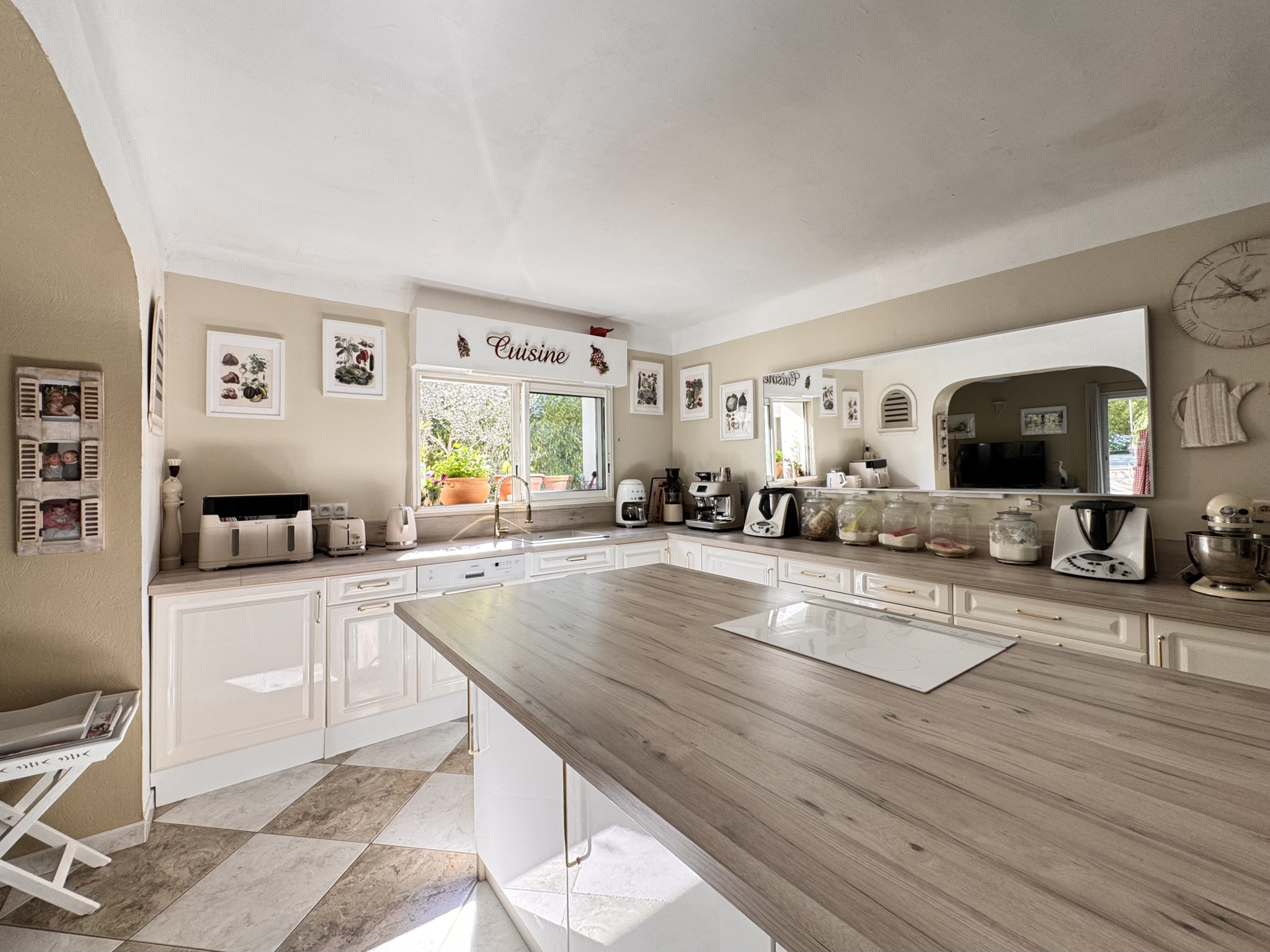 La cuisine équipée avec îlot central s'intègre parfaitement à cet espace convivial.