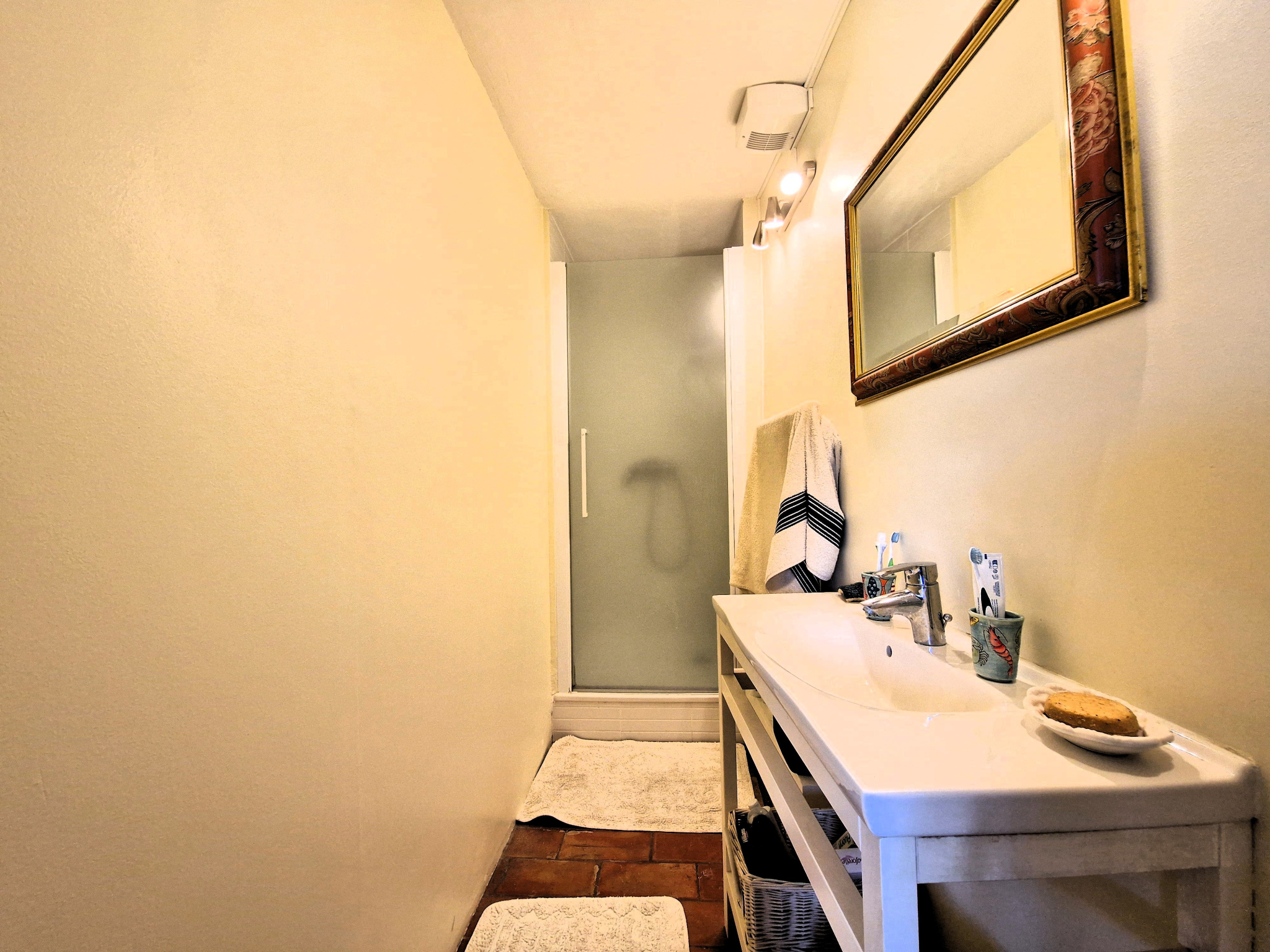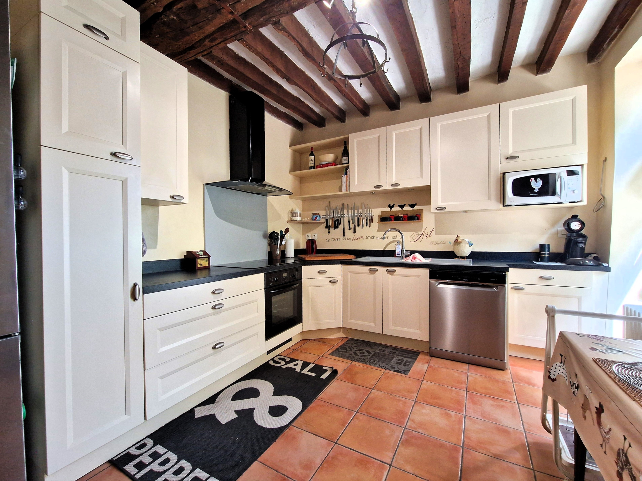 La maison se compose d'une entrée avec carreaux de ciment, une cuisine aménagée et équipée, une pièce pouvant servir de bureau ou de chambre et une pièce de vie de plus de 30 m2 avec cheminée et un accès direct sur la terrasse et le jardin.