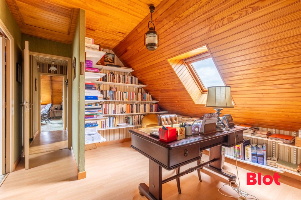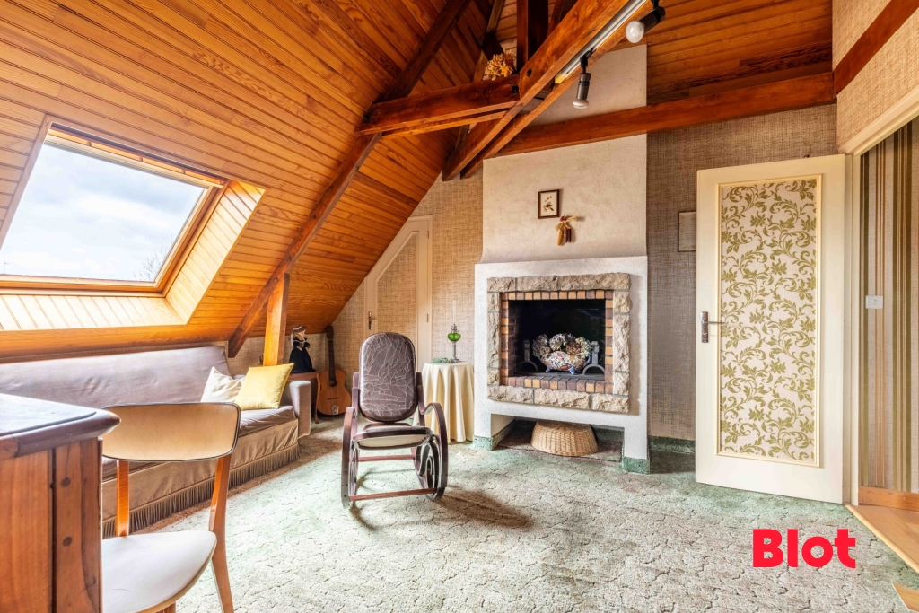 La visite se poursuit à l'étage avec un charmant salon d'étage avec cheminée, deux chambres, un bureau, une salle de bains avec WC ainsi qu'un grenier aménageable de plus de 9m² habitables.