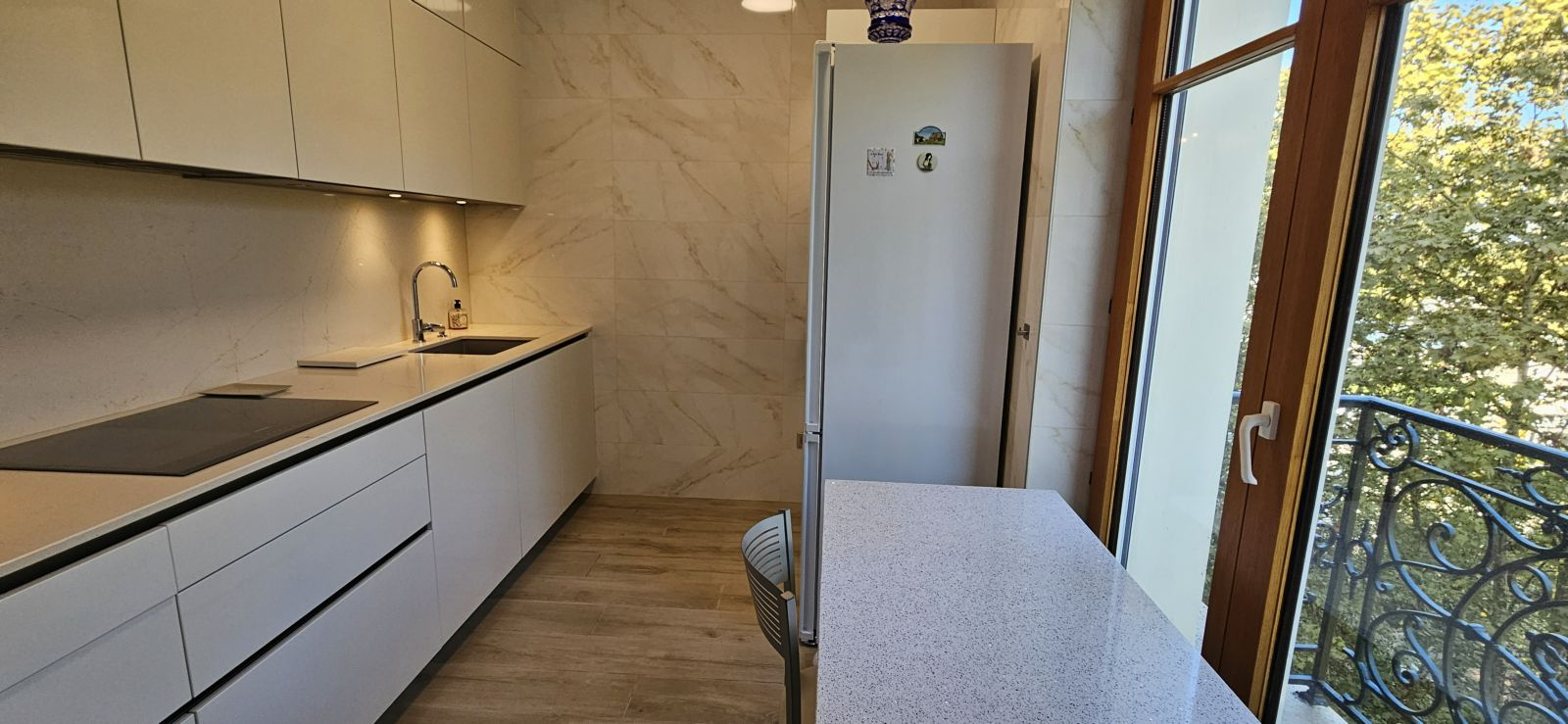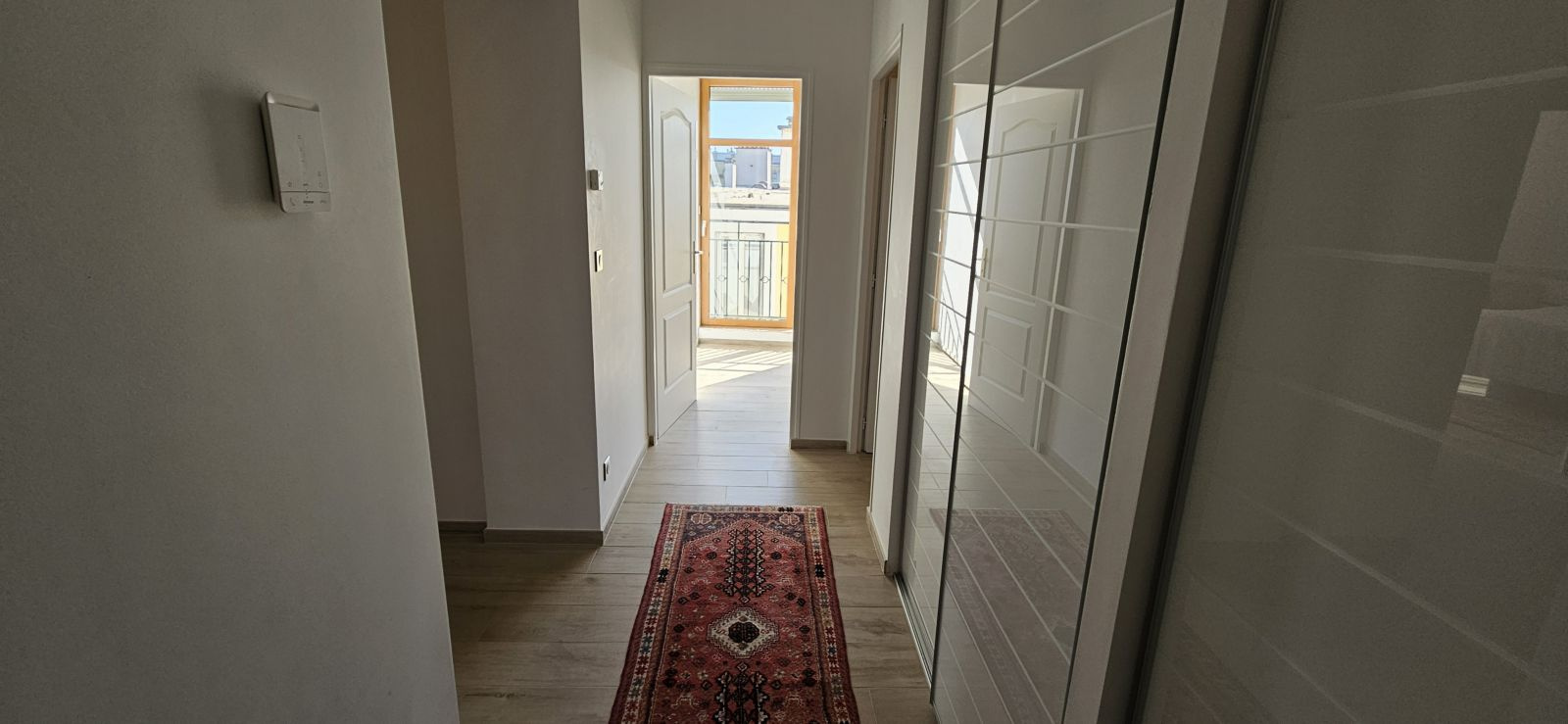 Belle entrée avec placards, séjour de 28 m2 avec placards et balcons, cuisine entièrement équipée.