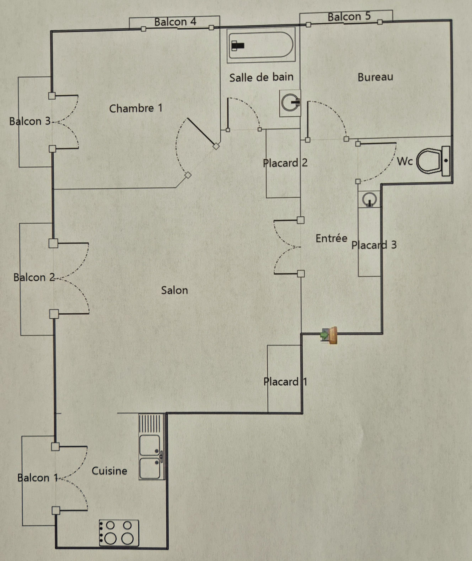 Une salle de bains aménagée, un bureau (ou petite chambre) avec balcon, wc.