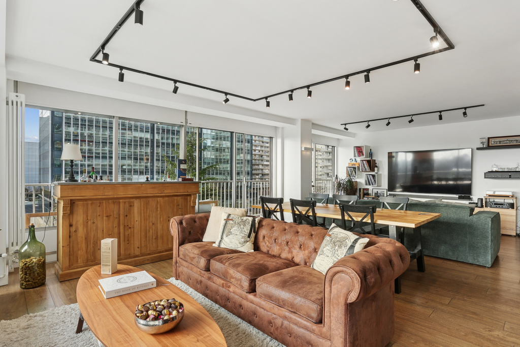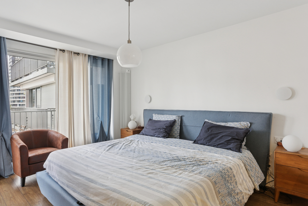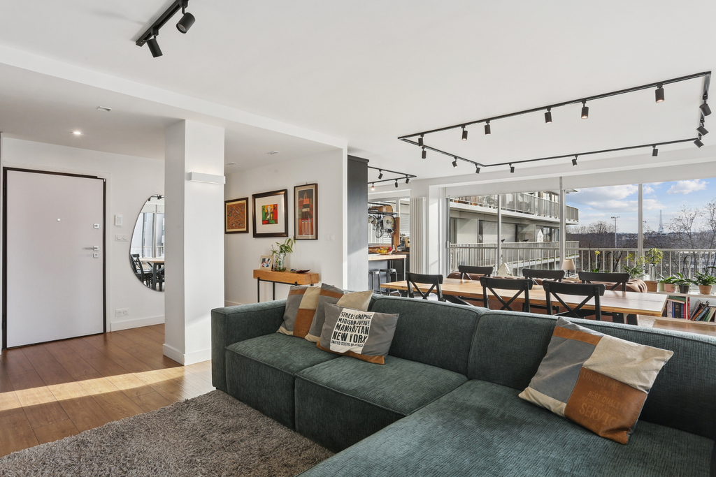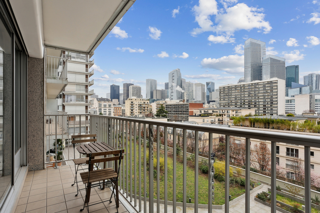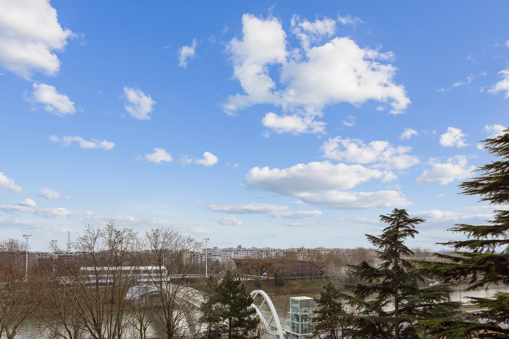 Le vaste double séjour de 40m², traversant et orienté Sud-Est/Sud-Ouest, s'ouvre sur une cuisine équipée avec îlot central, offrant une agréable pièce à vivre conviviale. Un balcon filant en L d'environ 22m² entoure l'appartement et dessert toutes les pièces, avec une vue dégagée sur la Seine et la tour Eiffel côté séjour et sur La Défense de l'autre côté. L'appartement comprend deux grandes chambres ainsi qu'une pièce d'environ 6m² utilisée aujourd'hui comme bureau.