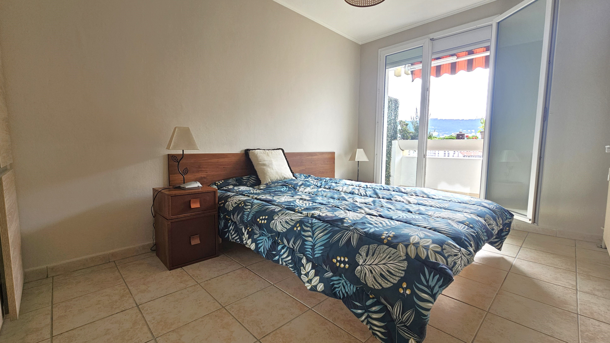 La chambre bénéficie de son balcon privatif, tandis que le séjour et la cuisine ouvrent sur un second espace extérieur, également exposé plein sud, avec vue dégagée et sans vis-à-vis.