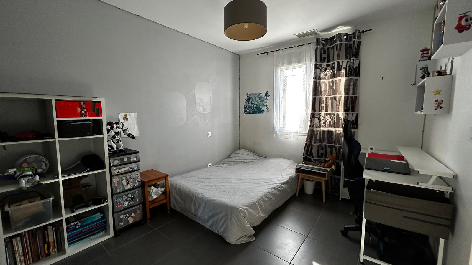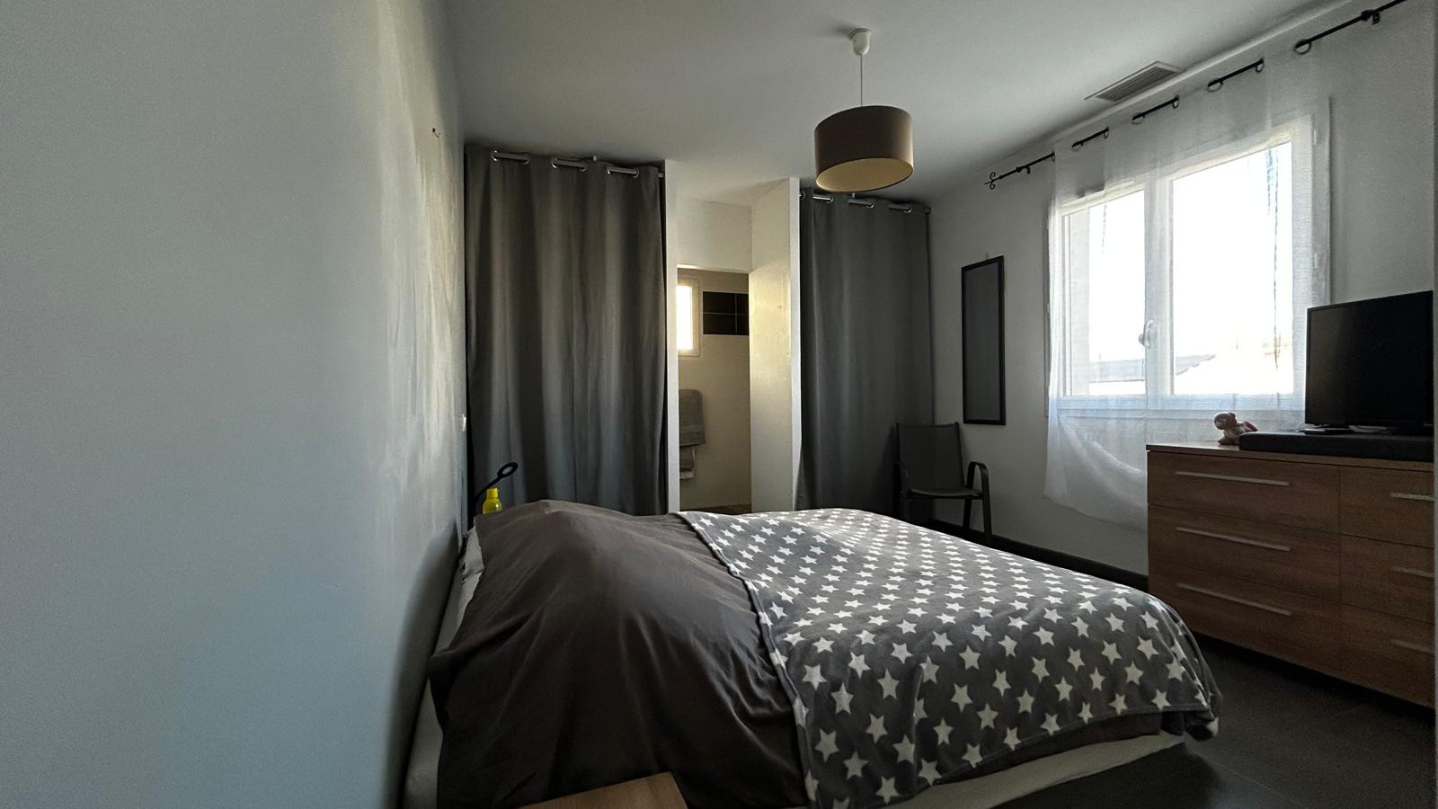 A l'étage, un espace nuit accueille deux grandes chambres équipées de placards et une salle de bain communicante.