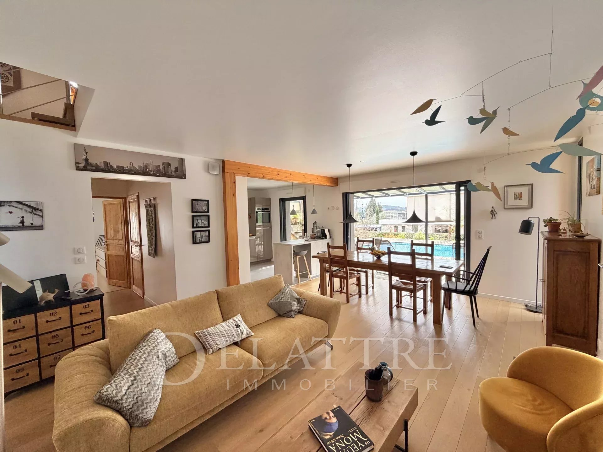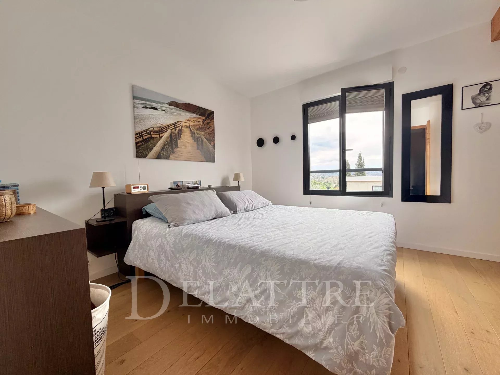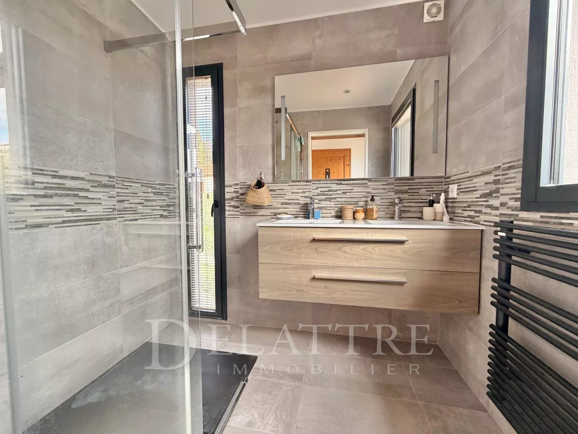 Exclusivité, Au calme, à 2 minutes des commerces, écoles et arrêts de Bus, au coeur d'un petit domaine, villa individuelle contemporaine avec son jardin de 800 m² environ avec vue golf et village, séjour très lumineux avec cuisine ouverte équipée avec cellier attenant ,baies vitrées à galandage donnant sur la terrasse plein sud et la piscine au sel de construction traditionnelle, une suite de plain-pied.