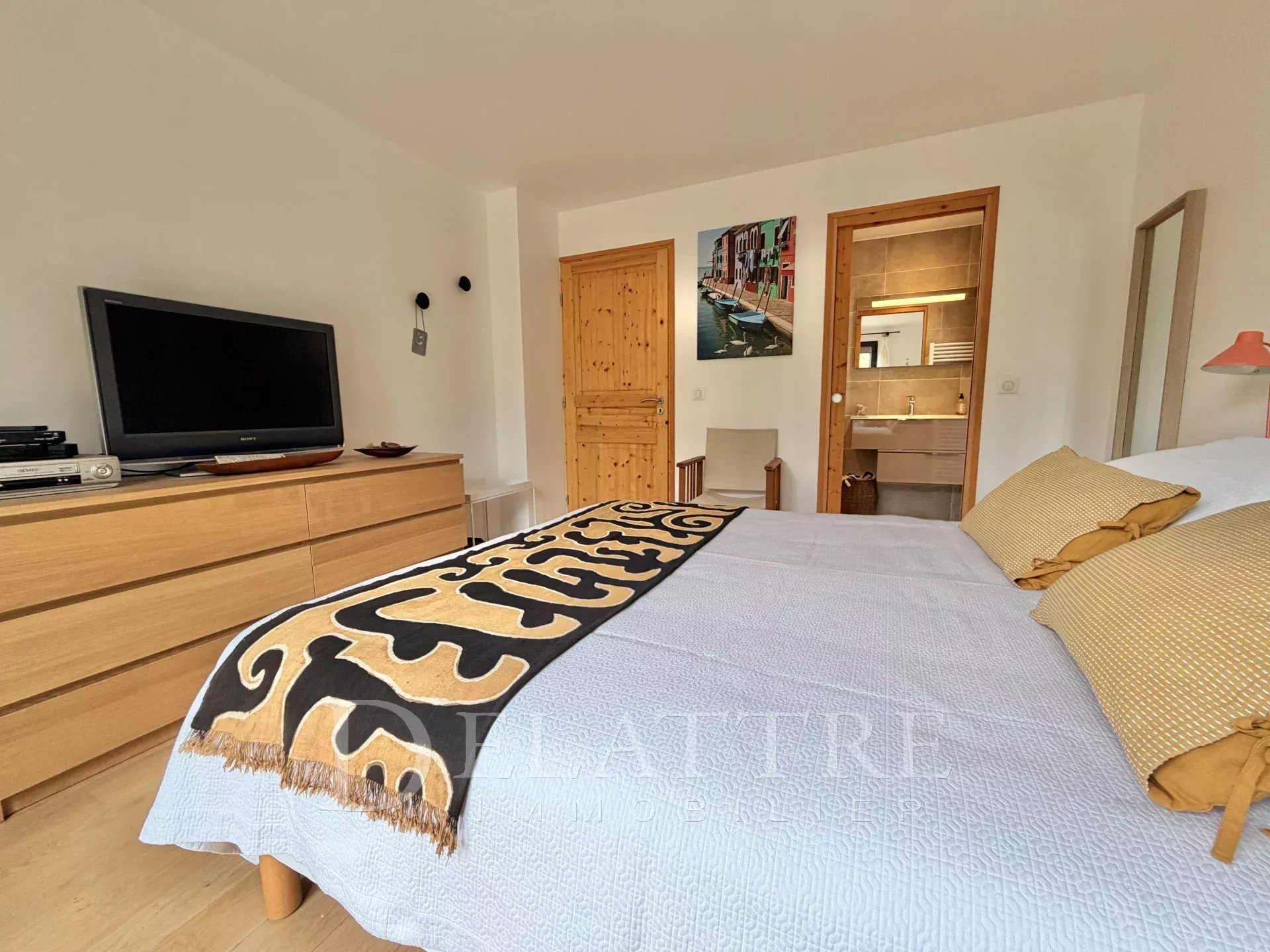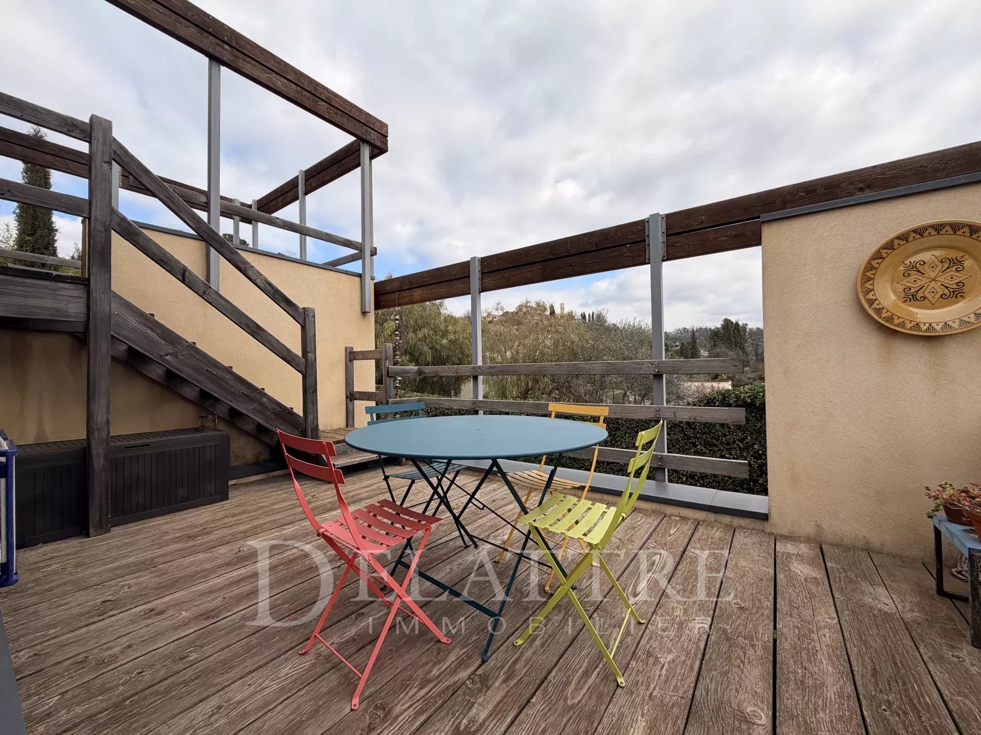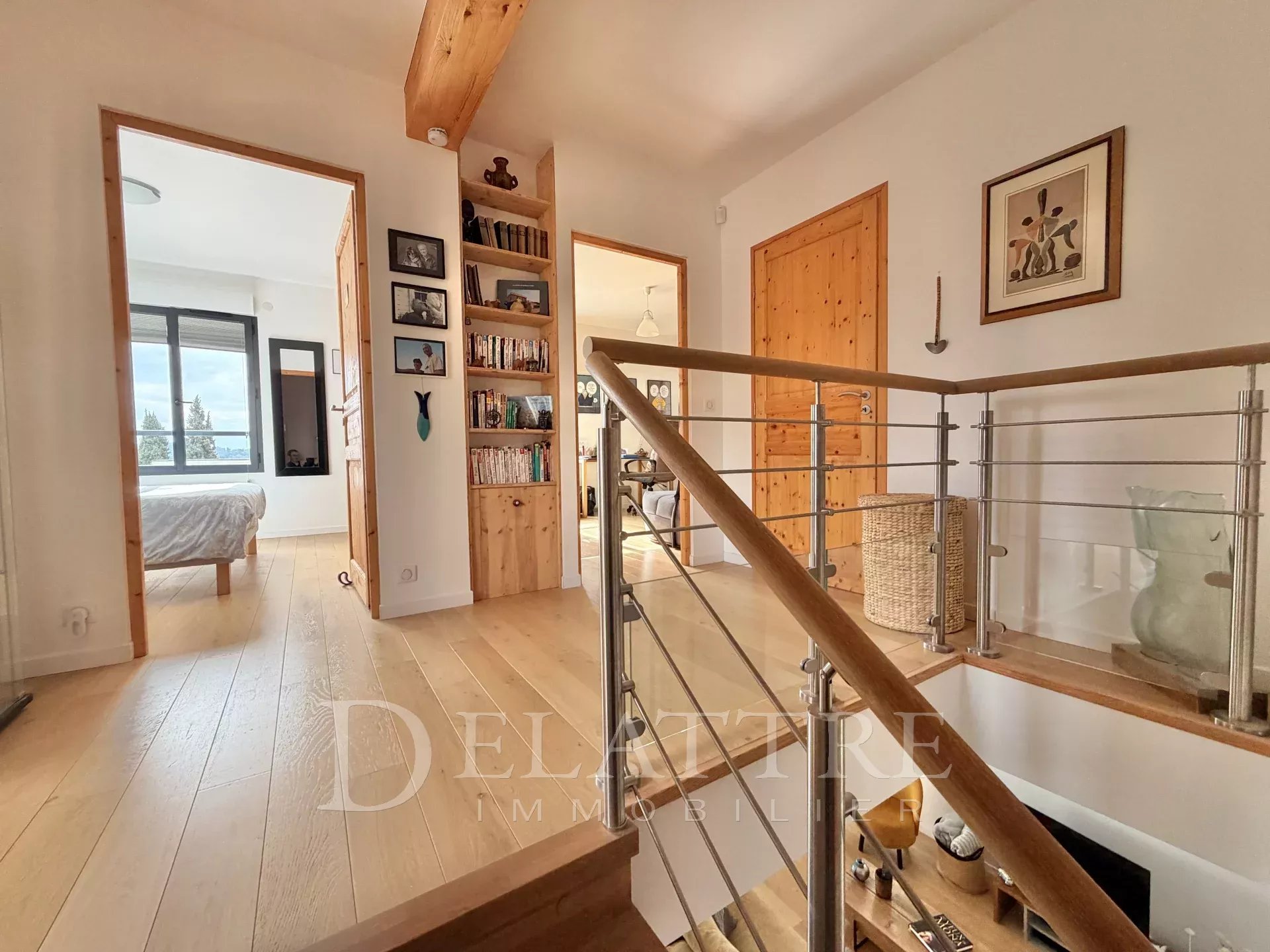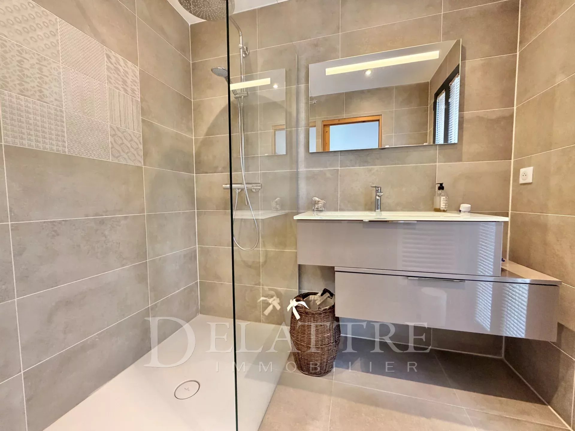 Exclusivité, Au calme, à 2 minutes des commerces, écoles et arrêts de Bus, au coeur d'un petit domaine, villa individuelle contemporaine avec son jardin de 800 m² environ avec vue golf et village, séjour très lumineux avec cuisine ouverte équipée avec cellier attenant ,baies vitrées à galandage donnant sur la terrasse plein sud et la piscine au sel de construction traditionnelle, une suite de plain-pied.