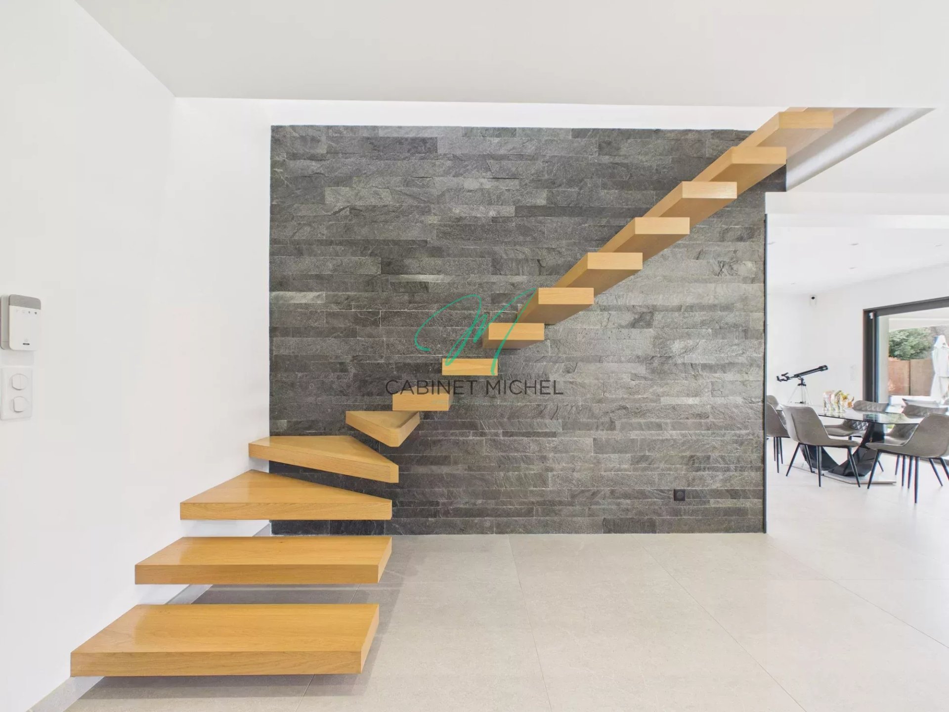 Le rez-de-chaussée accueille une entrée avec penderie et WC invités, un vaste espace de réception lumineux composé d’un séjour et d’une salle à manger avec cuisine ouverte entièrement équipée, prolongé par une arrière-cuisine. L’ensemble s’ouvre largement sur une agréable terrasse couverte et les espaces extérieurs.