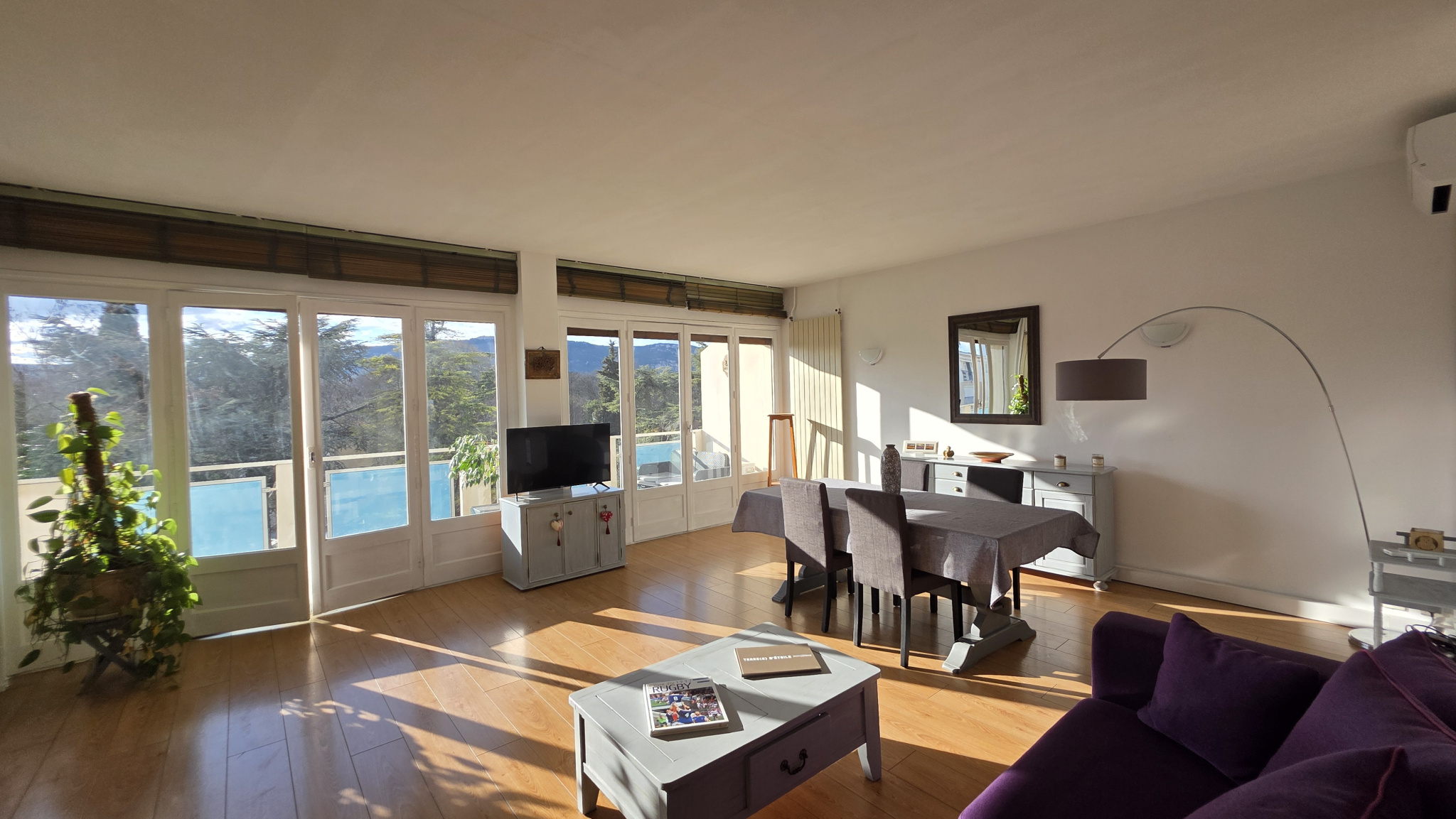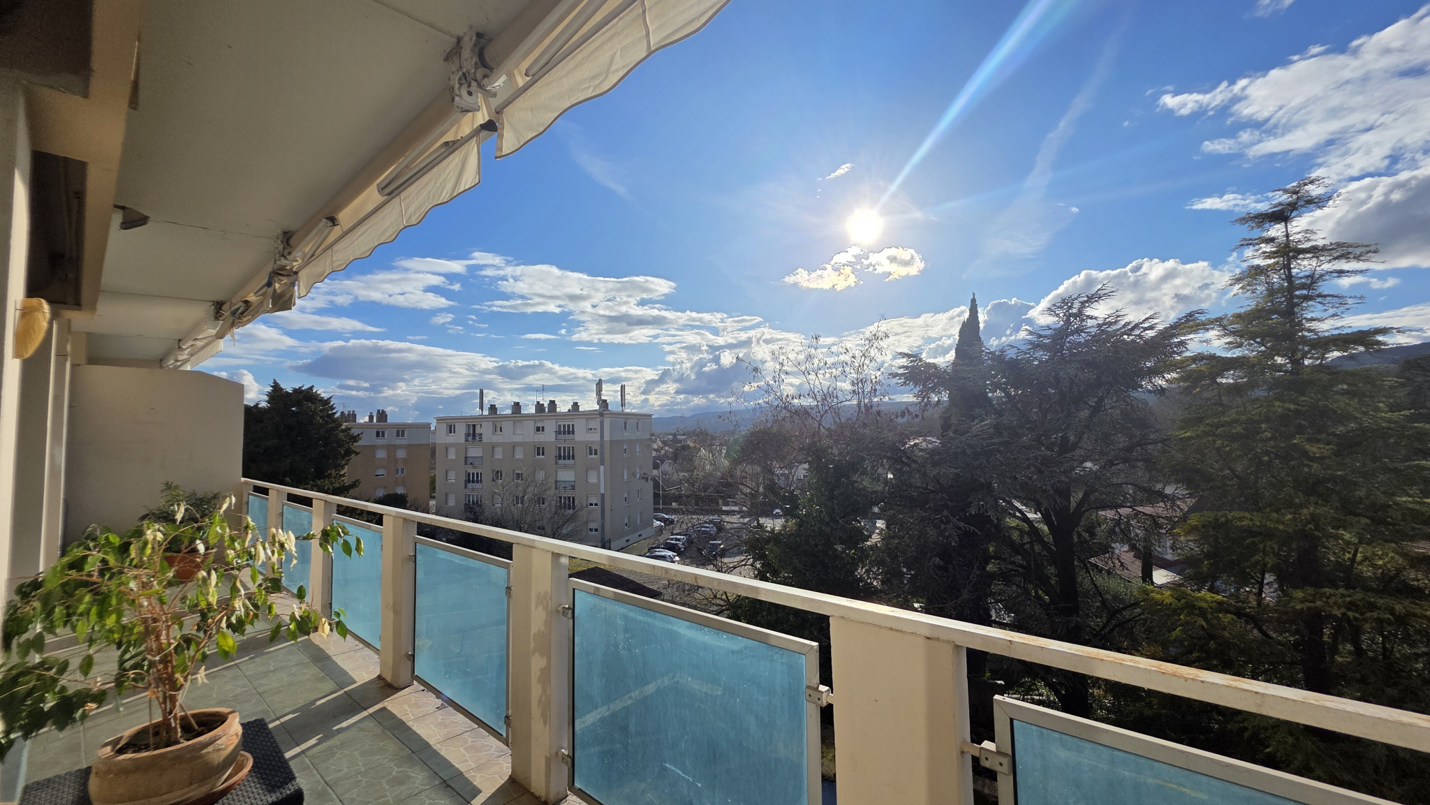 Vous profiterez d'un bel espace de vie orienté par de grandes baies sur un balcon bénéficiant d'une vue dégagée à l'Ouest sur les Monts de l'Ardèche, une cuisine séparée et équipée, un espace bureau et une grande chambre (deux à l'origine) avec balcon, salle d'eau (avec wc) et toilette indépendant.