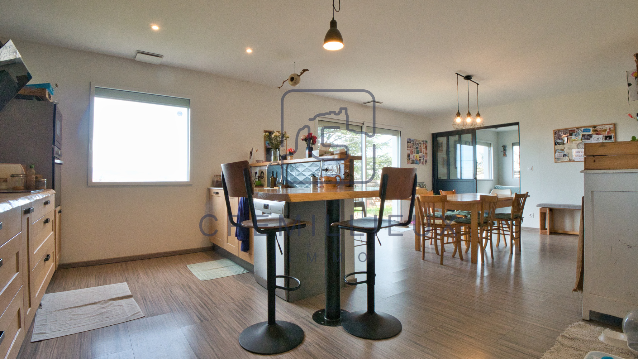 Cette maison de plain pied propose une distribution fonctionnelle et moderne. L'entrée s'ouvre sur une vaste pièce de vie composée d'une cuisine ouverte sur la salle à manger et d'un salon équipé d'une porte coulissante permettant de créer, selon vos envies, un espace salon fermé et intimiste ou semi-ouvert sur l'espace de vie. Le coin nuit comprend trois chambres, une salle d'eau, et une salle de bain ainsi qu'une quatrième chambre actuellement aménagée en bureau. Une buanderie complète l'ensemble et un garage double de plus de 40 m2 vient parfaire les prestations.