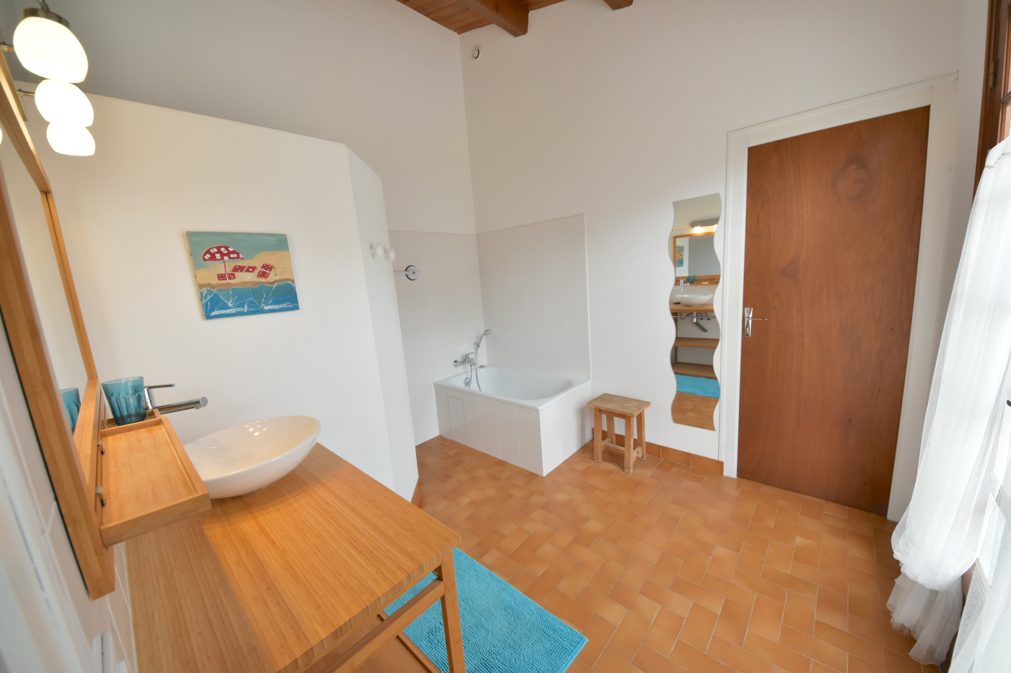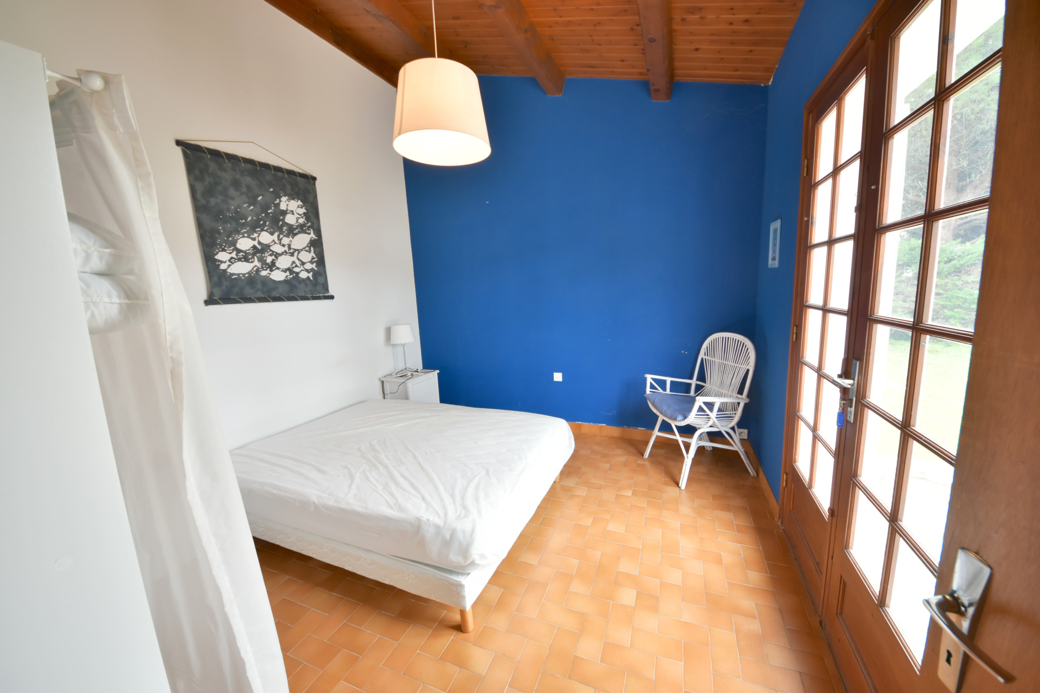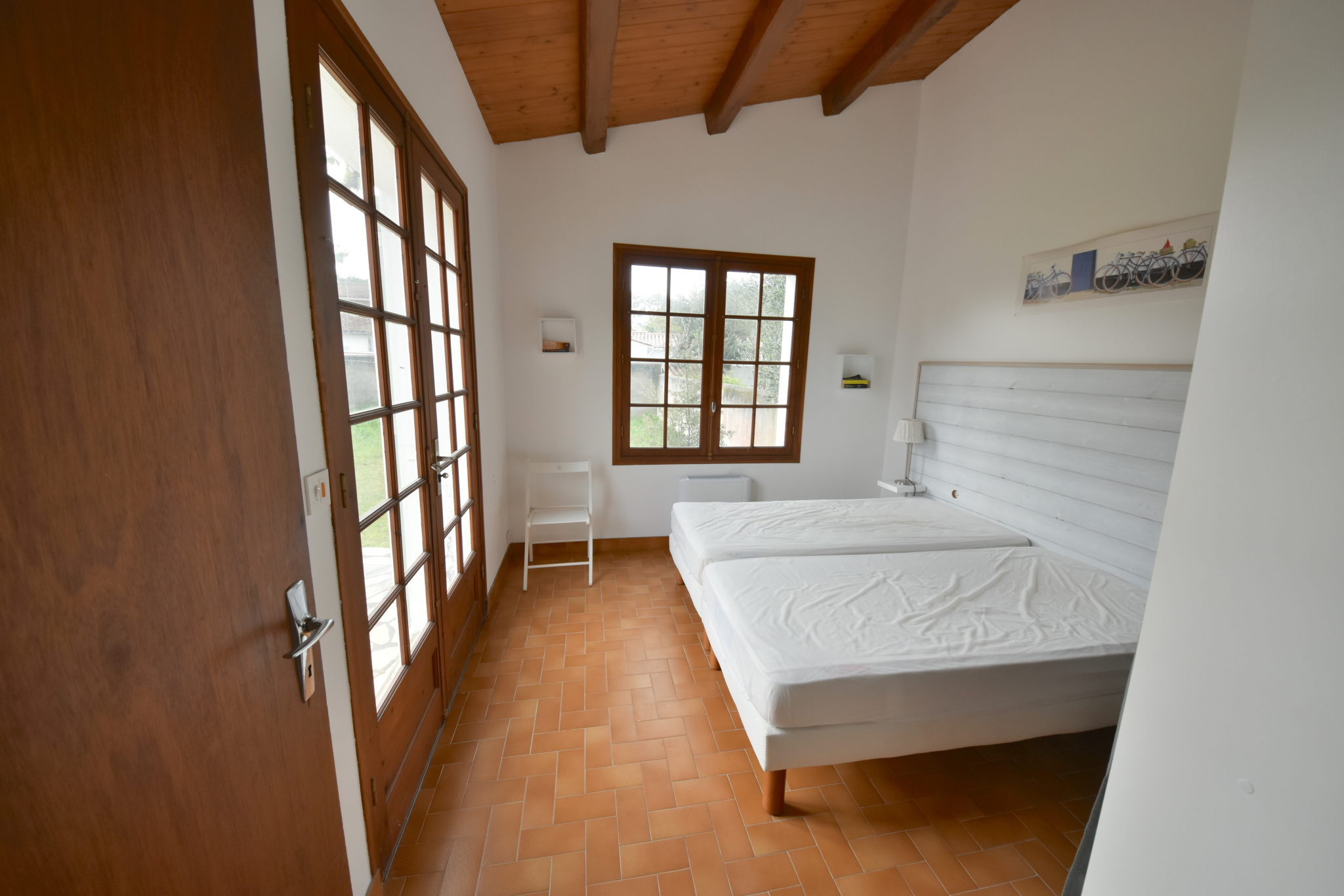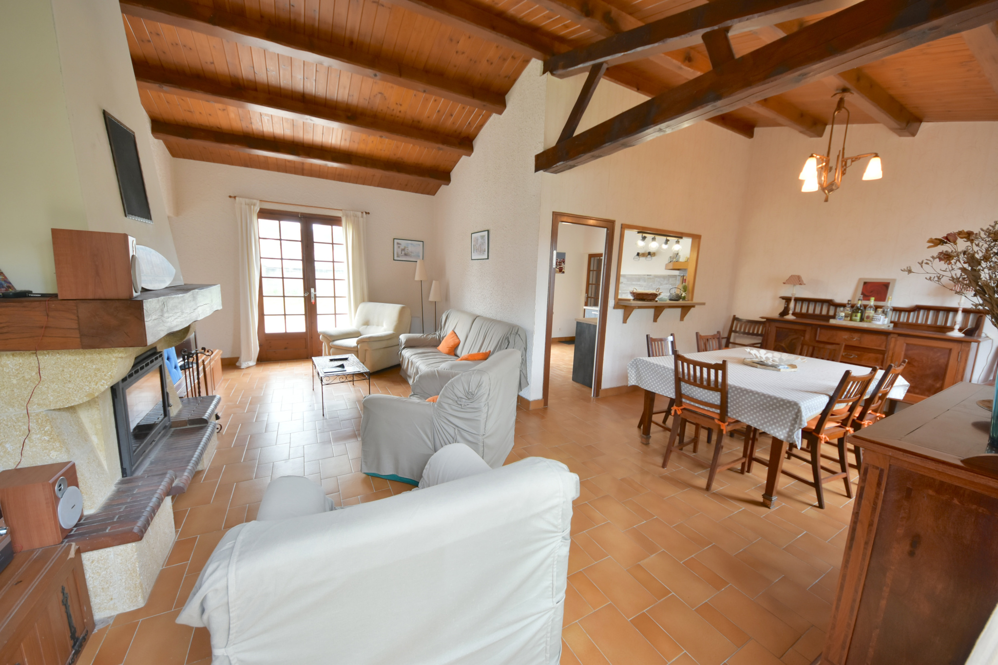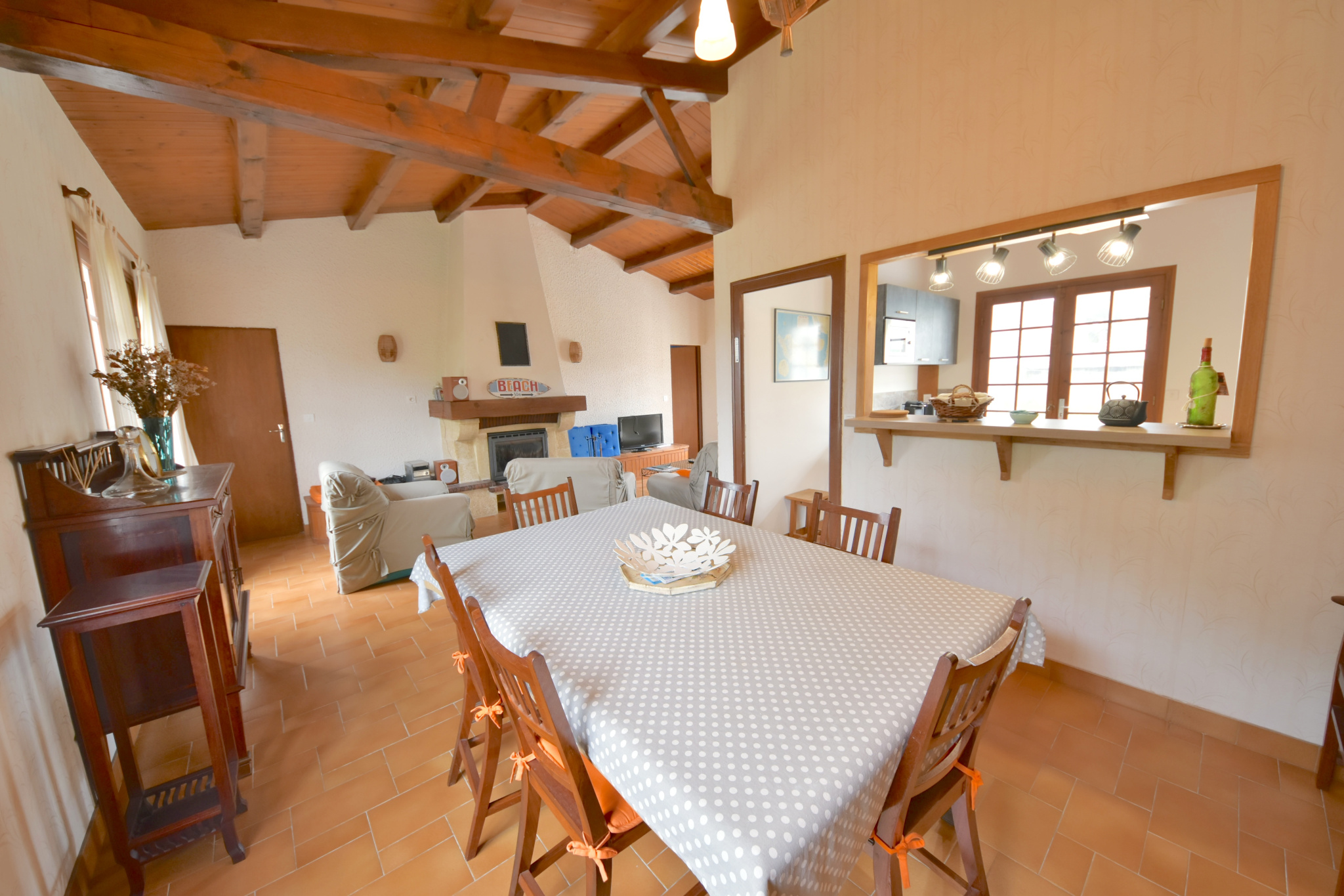 Sur un grand terrain de 1195m2 clôturé et arboré, à proximité immédiate de la plage à pied, agréable maison composée: salon-séjour avec cuisine donnant sur une grande terrasse, trois chambres, salle de bains, wc et garage.