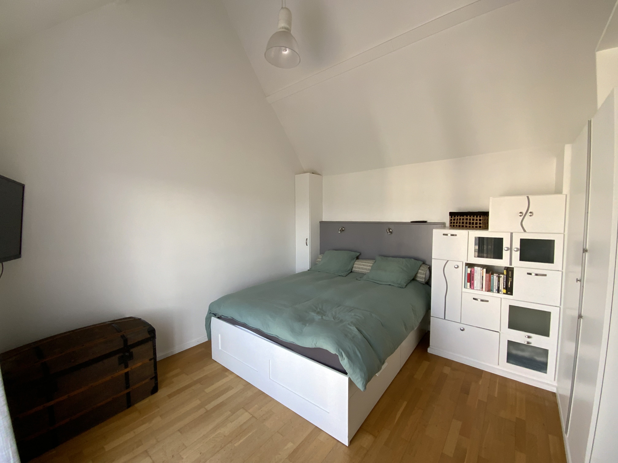 A l'étage : un palier avec placards de rangement sous pente, une chambre mansardée avec meubles de rangement intégrés et une porte fenêtre avec garde corps donnant sur le jardin et une seconde chambre mansardée avec une première partie dressing disposant de divers placard de rangement, d'une partie nuit et d'une d'un point d'eau comportant un lavabo sur pied et un WC.