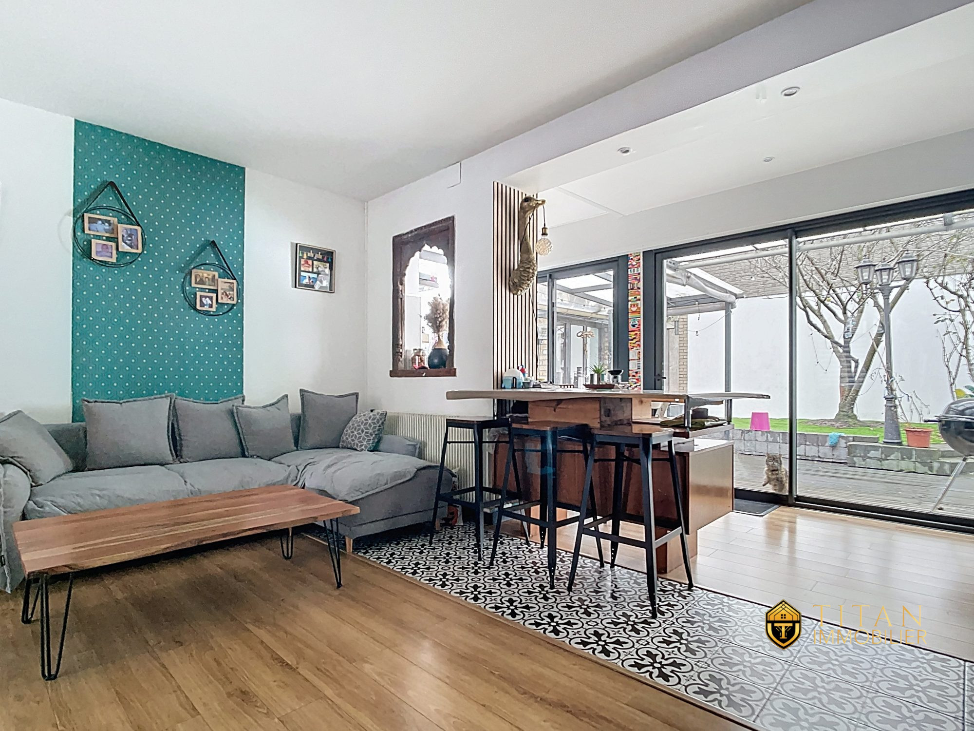 Au rez-de-chaussée, vous trouverez une cuisine américaine aménagée et équipée, ouverte sur un espace de vie convivial et lumineux.