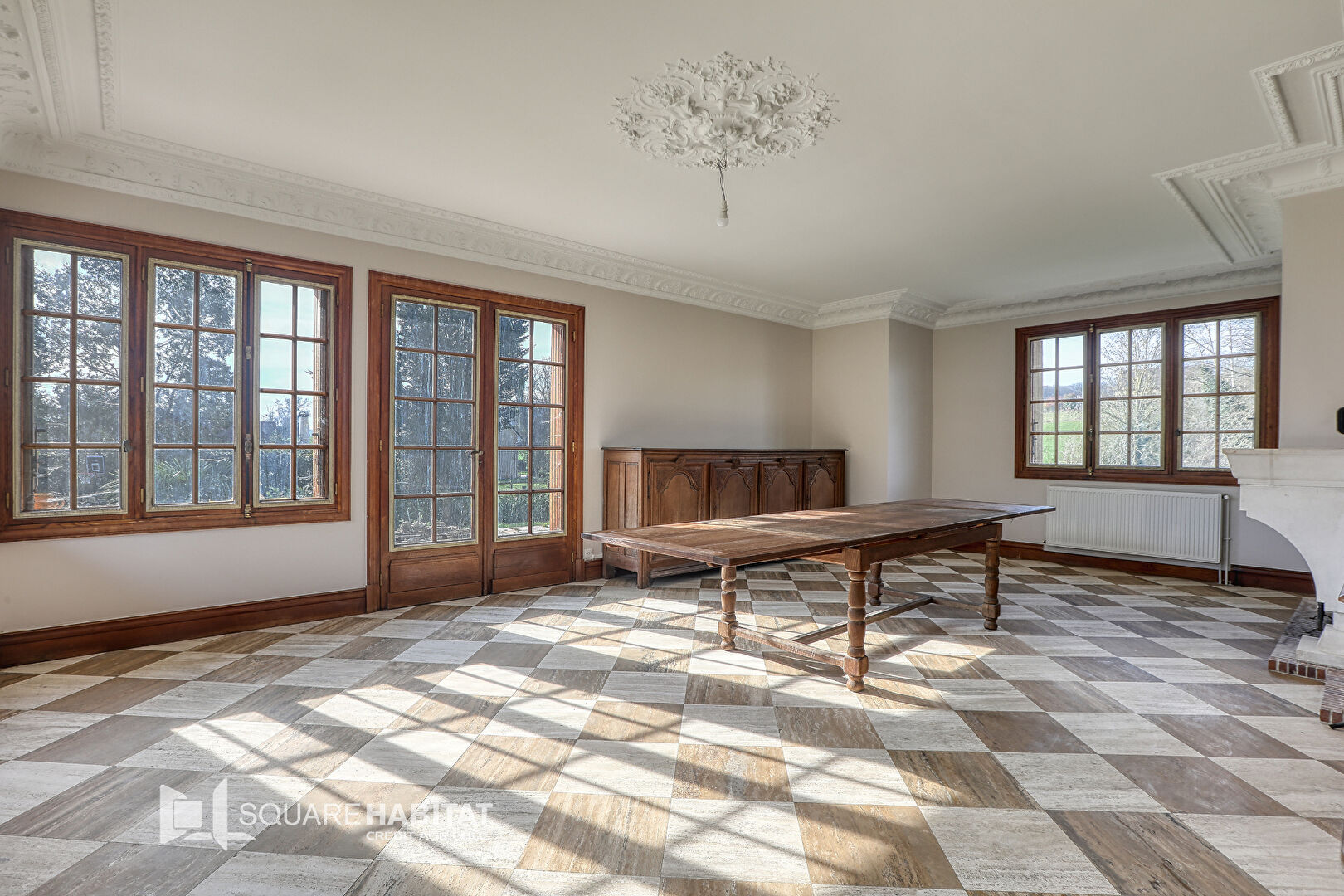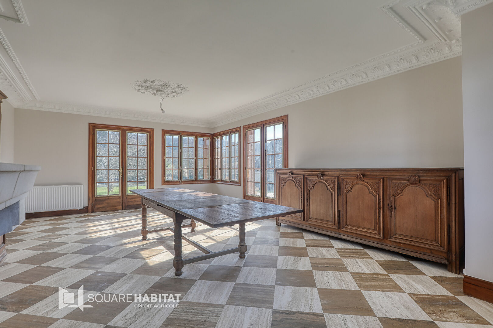 Elle se compose d'une entrée spacieuse desservant un séjour, une cuisine et un salon. La pièce de vie principale, très lumineuse, est agrémentée d'une cheminée et donne un accès direct à la terrasse et au jardin.