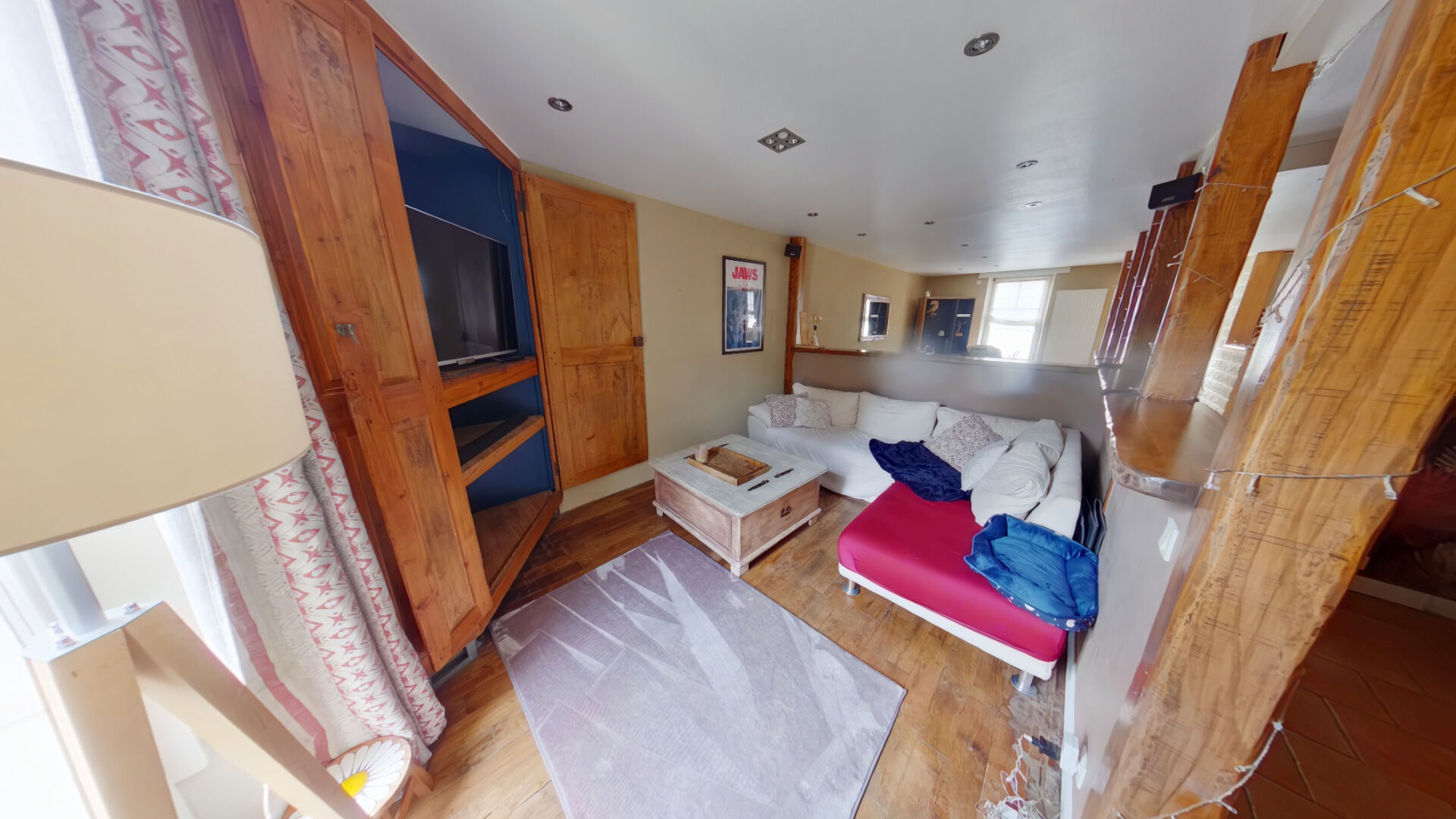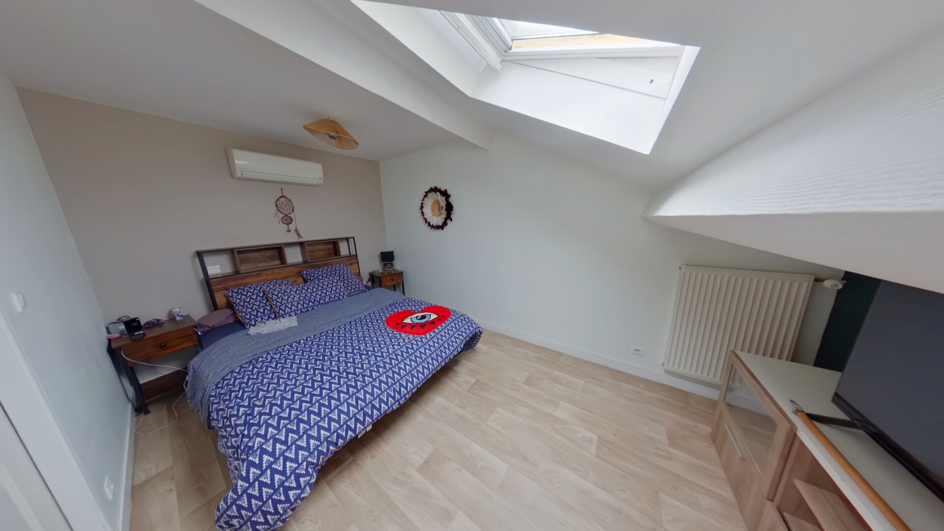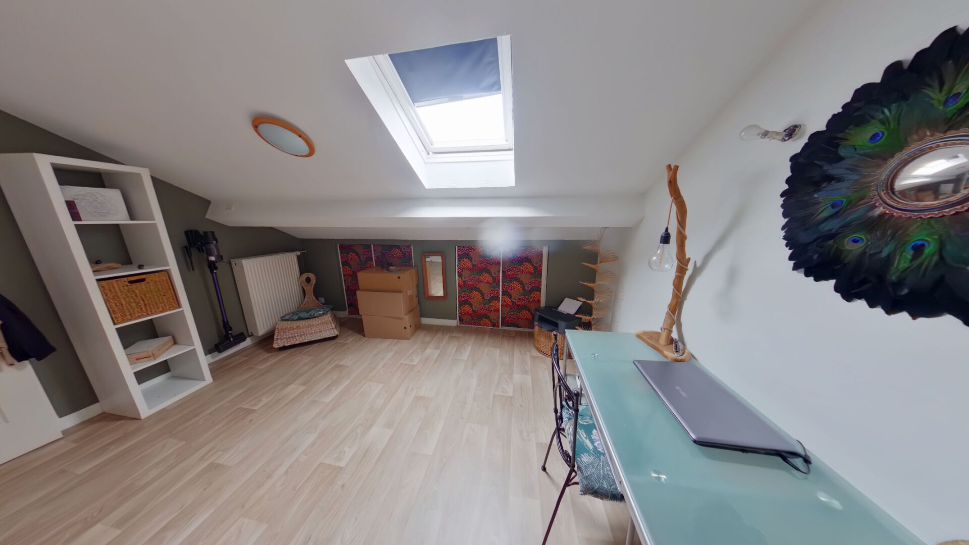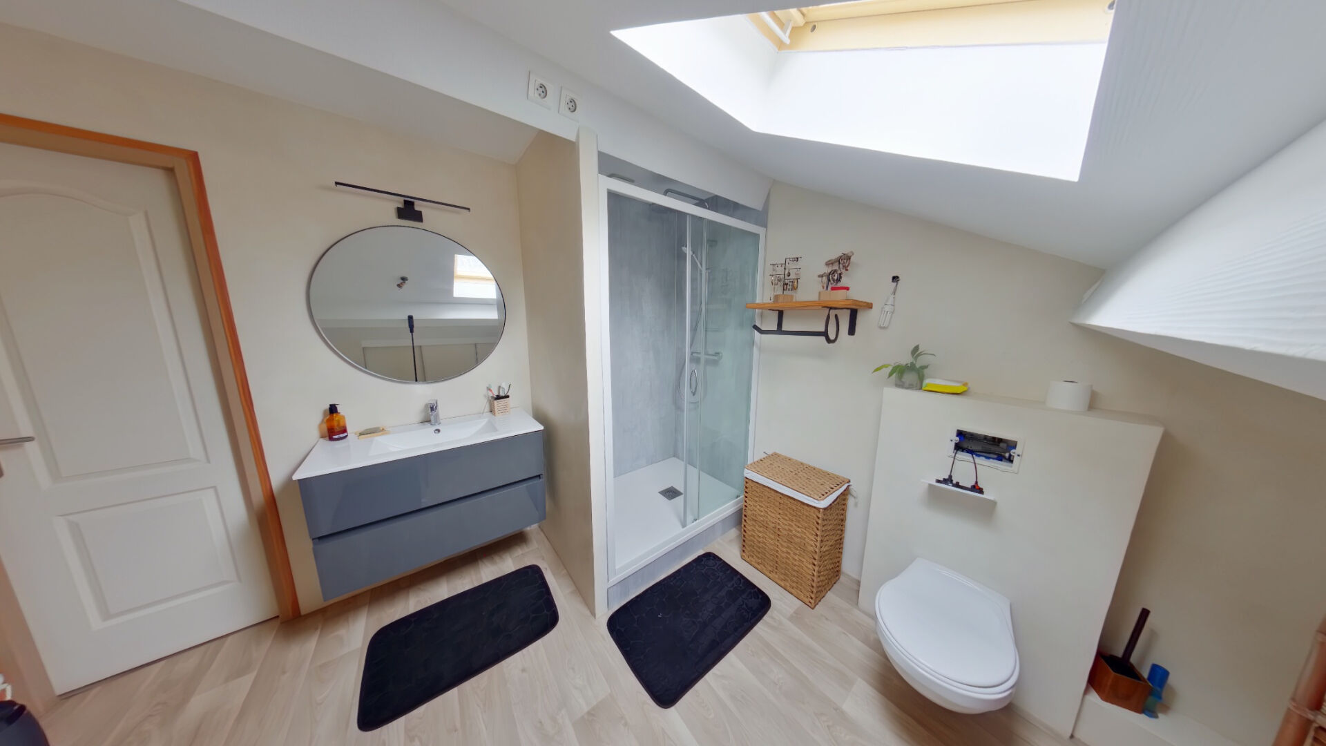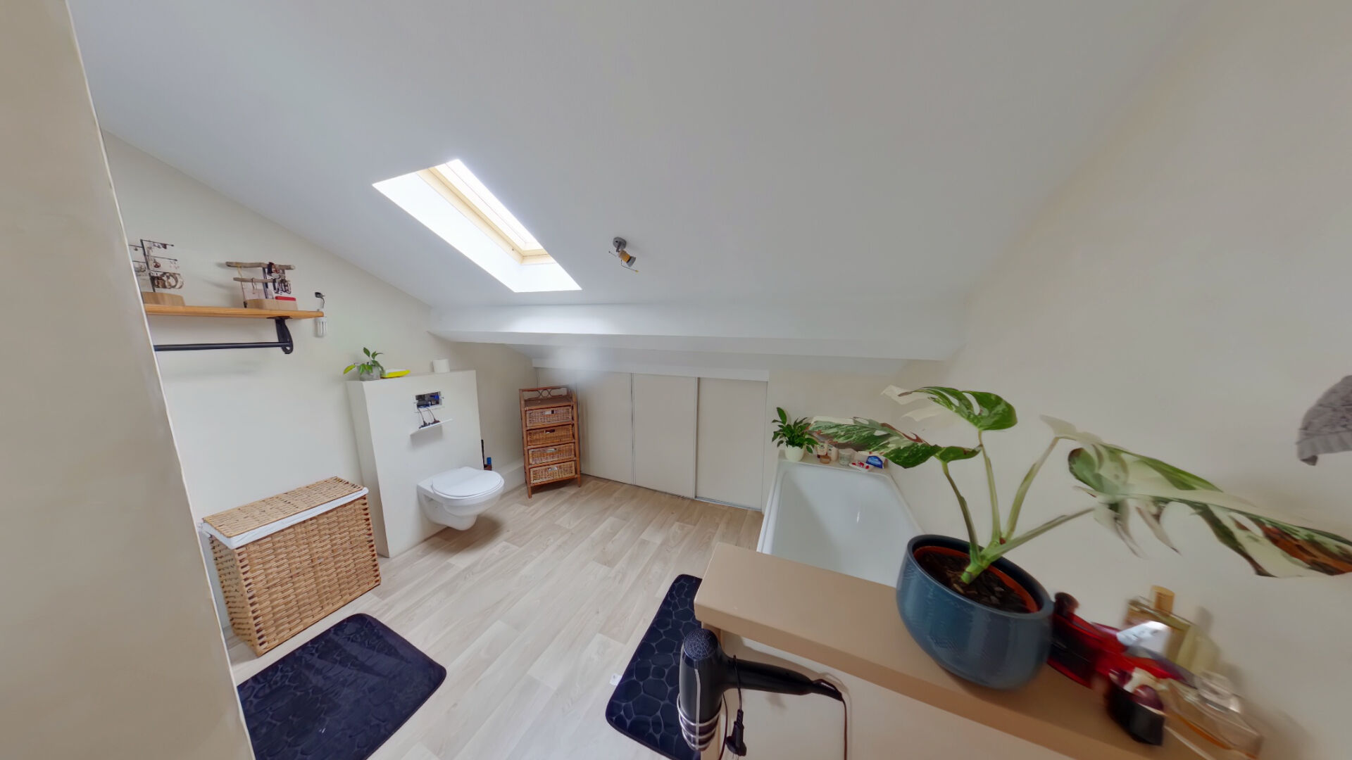 Une grande pièce palière de 20 m² offrant un espace bureau ou détente supplémentaire, 2 chambres, une salle de bains avec douche et un WC.