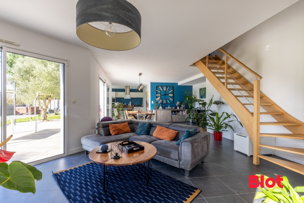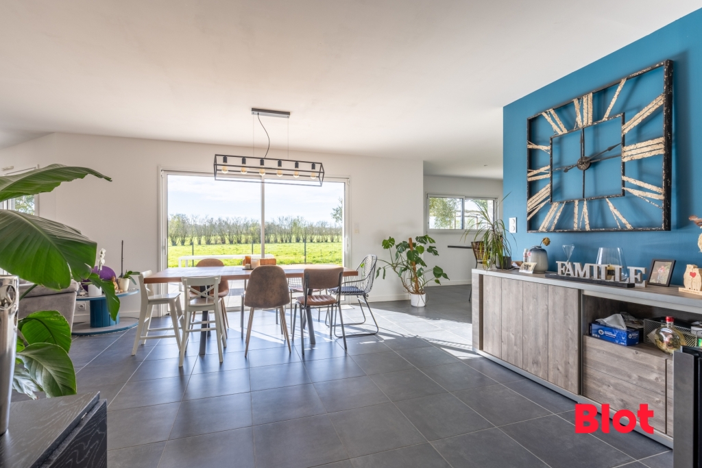 Dès l'entrée, vous découvrez une belle pièce de vie lumineuse, largement ouverte sur le jardin grâce à ses grandes baies vitrées.