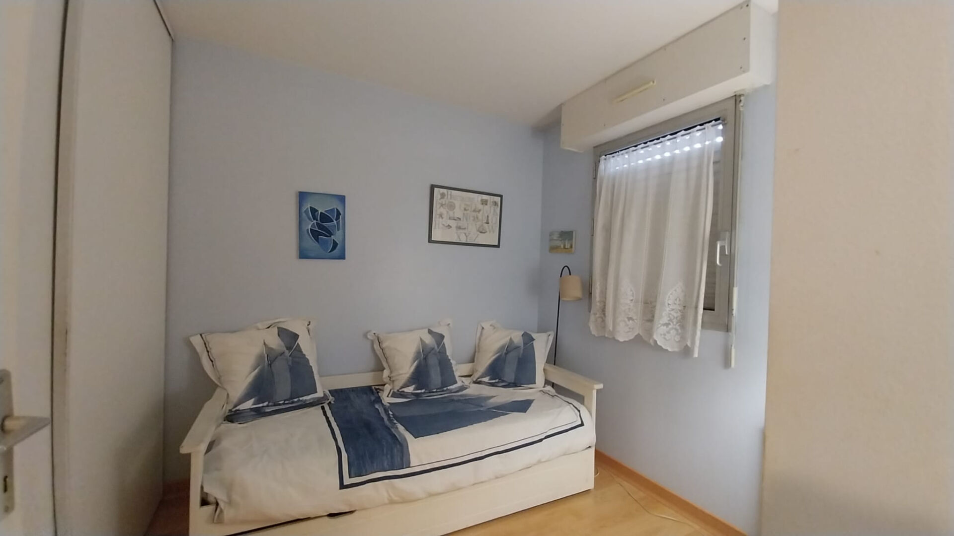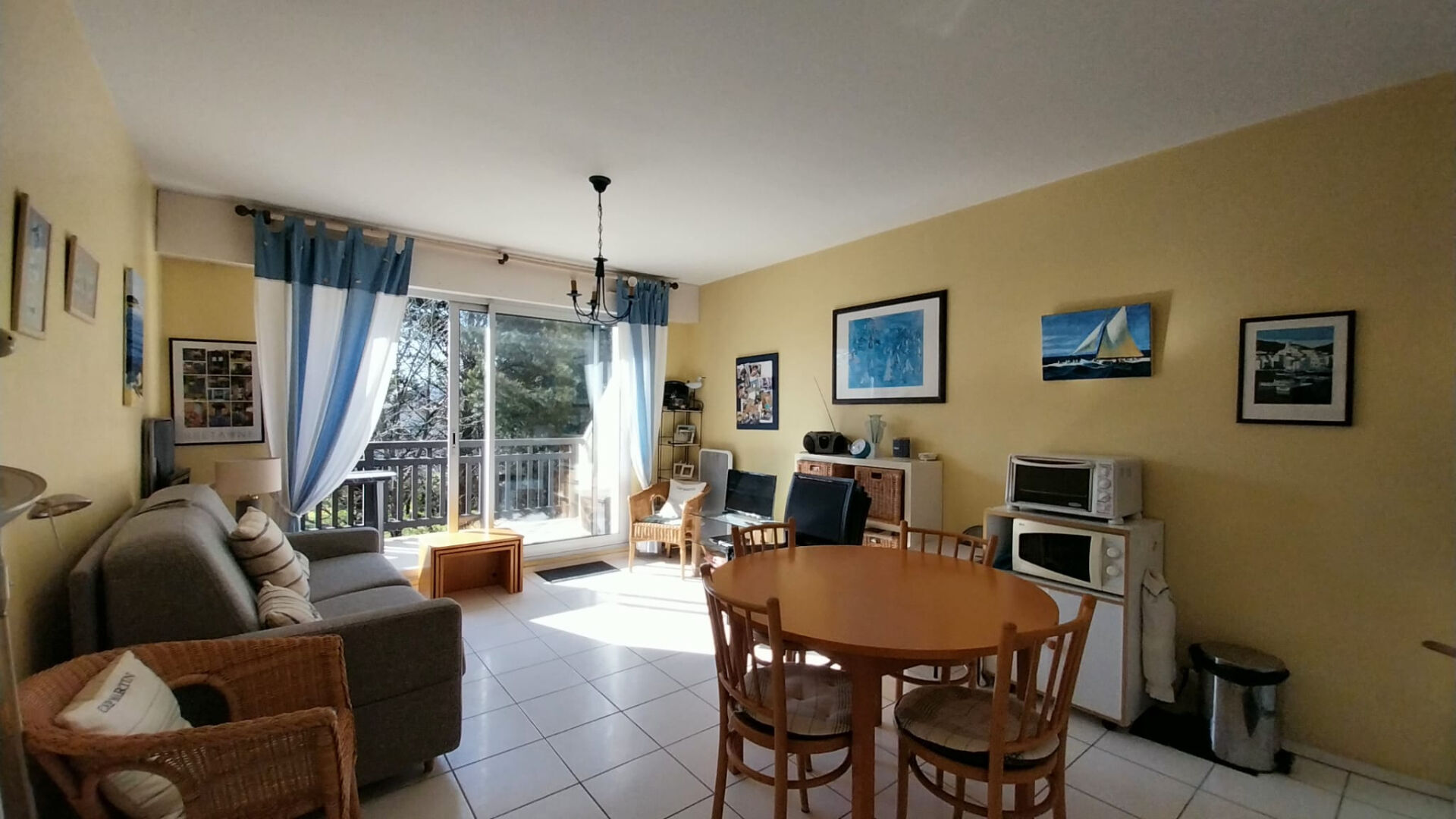 Commerces et plage a pieds pour cet appartement lumineux ouvrant sur une terrasse dans un cadre arboré .