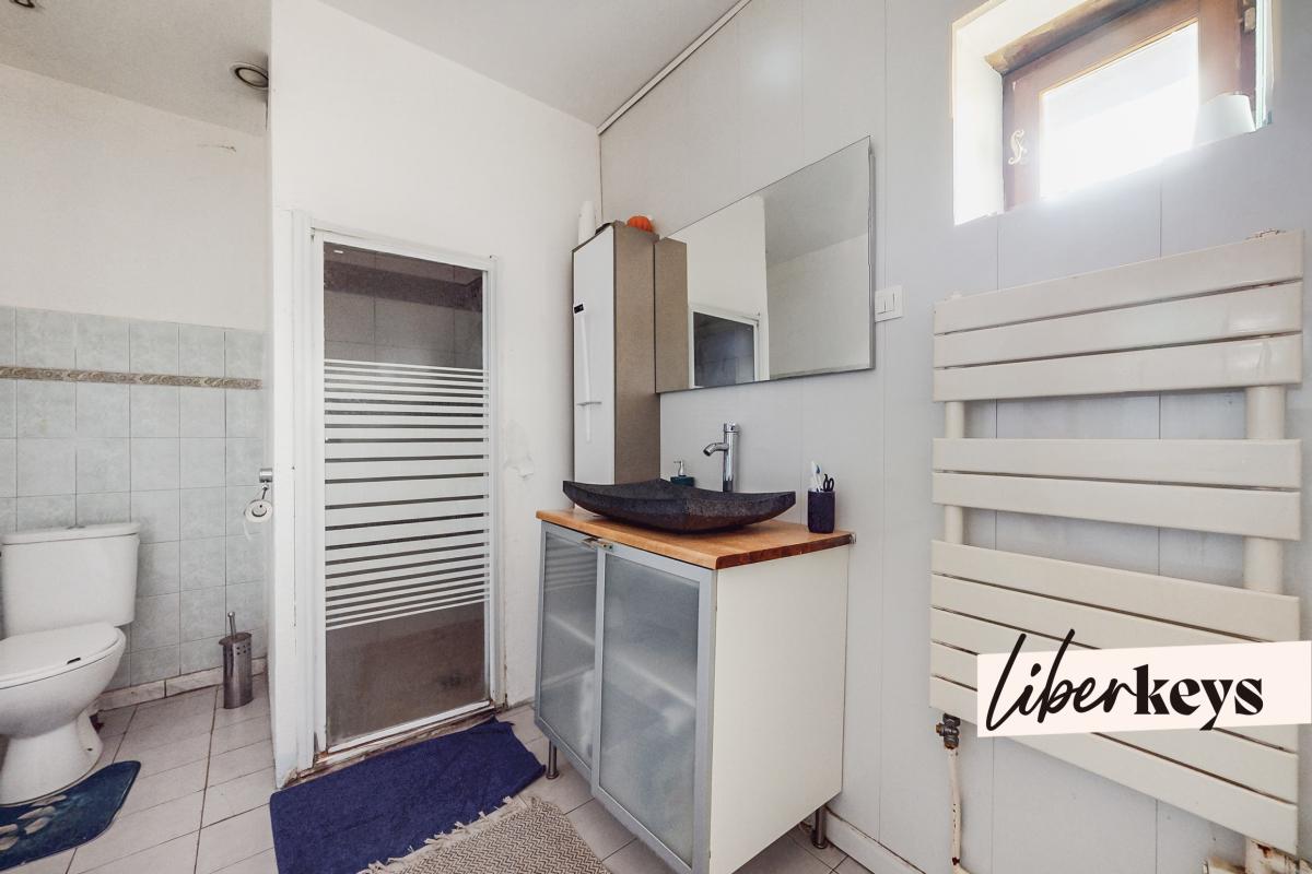 Sur un demi niveau, accessible par de récents escaliers en bois, vous trouverez une salle de bain.