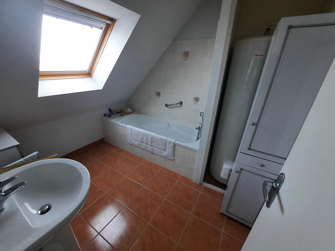 Au premier étage, un palier dessert trois chambres ainsi qu'une salle de bains comprenant une baignoire et une vasque. Un WC indépendant est également présent.