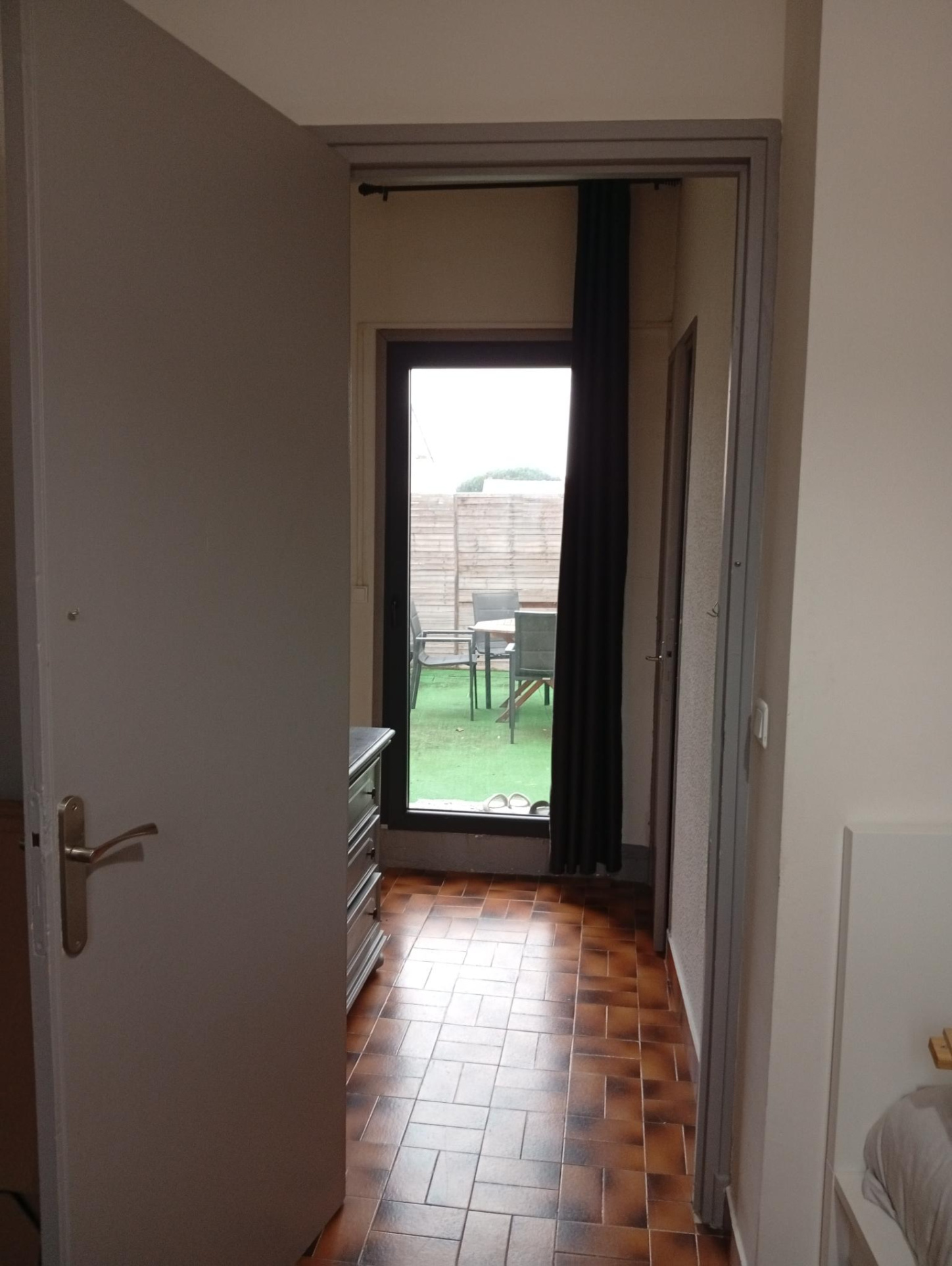 Le couloir qui dessert la seconde chambre de 15 m2, la salle de douche et la terrasse parfaite pour profiter du soleil méditerranéen et pour vos grillades entre amis !