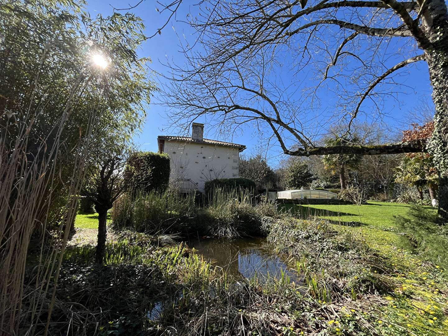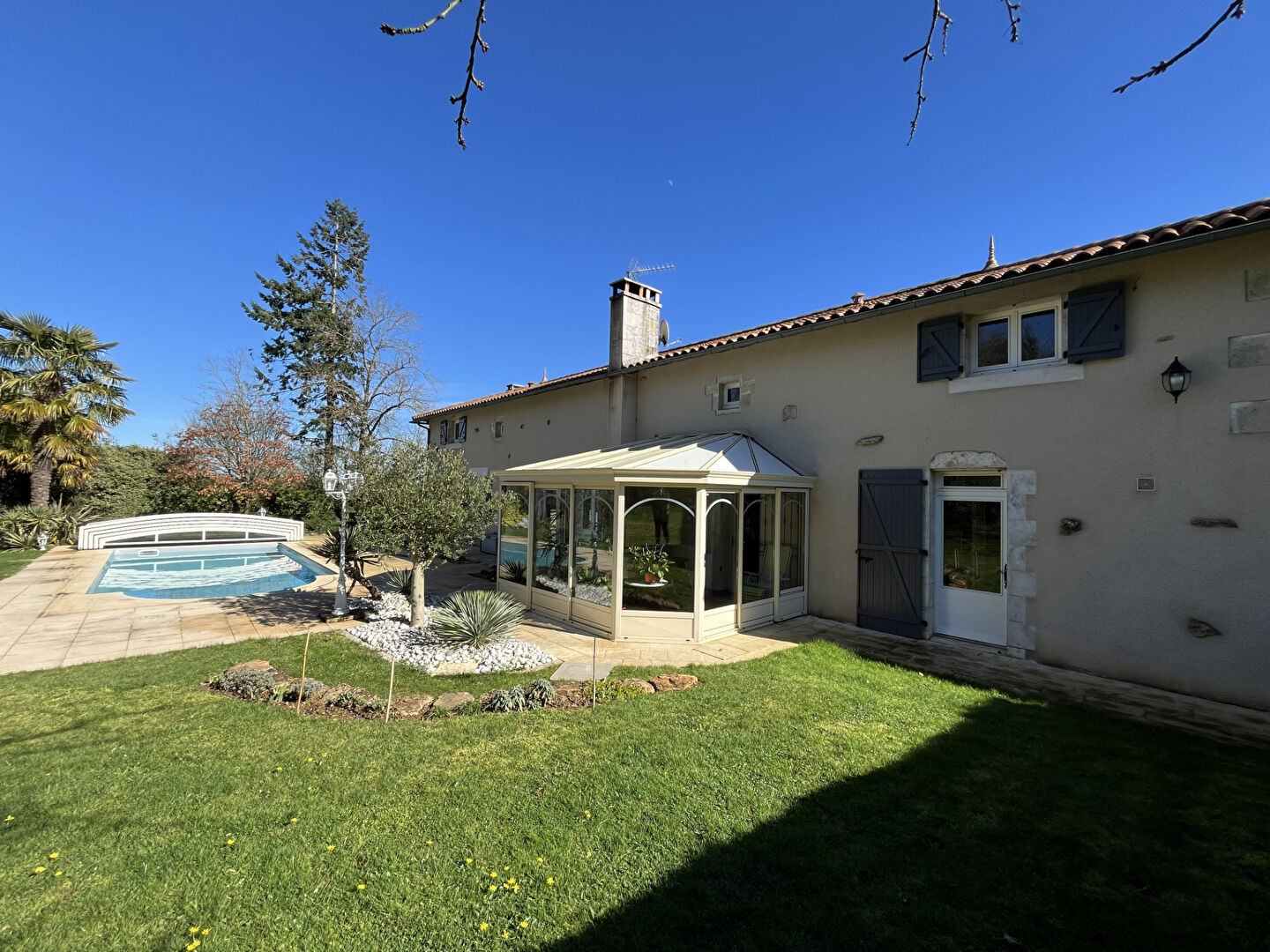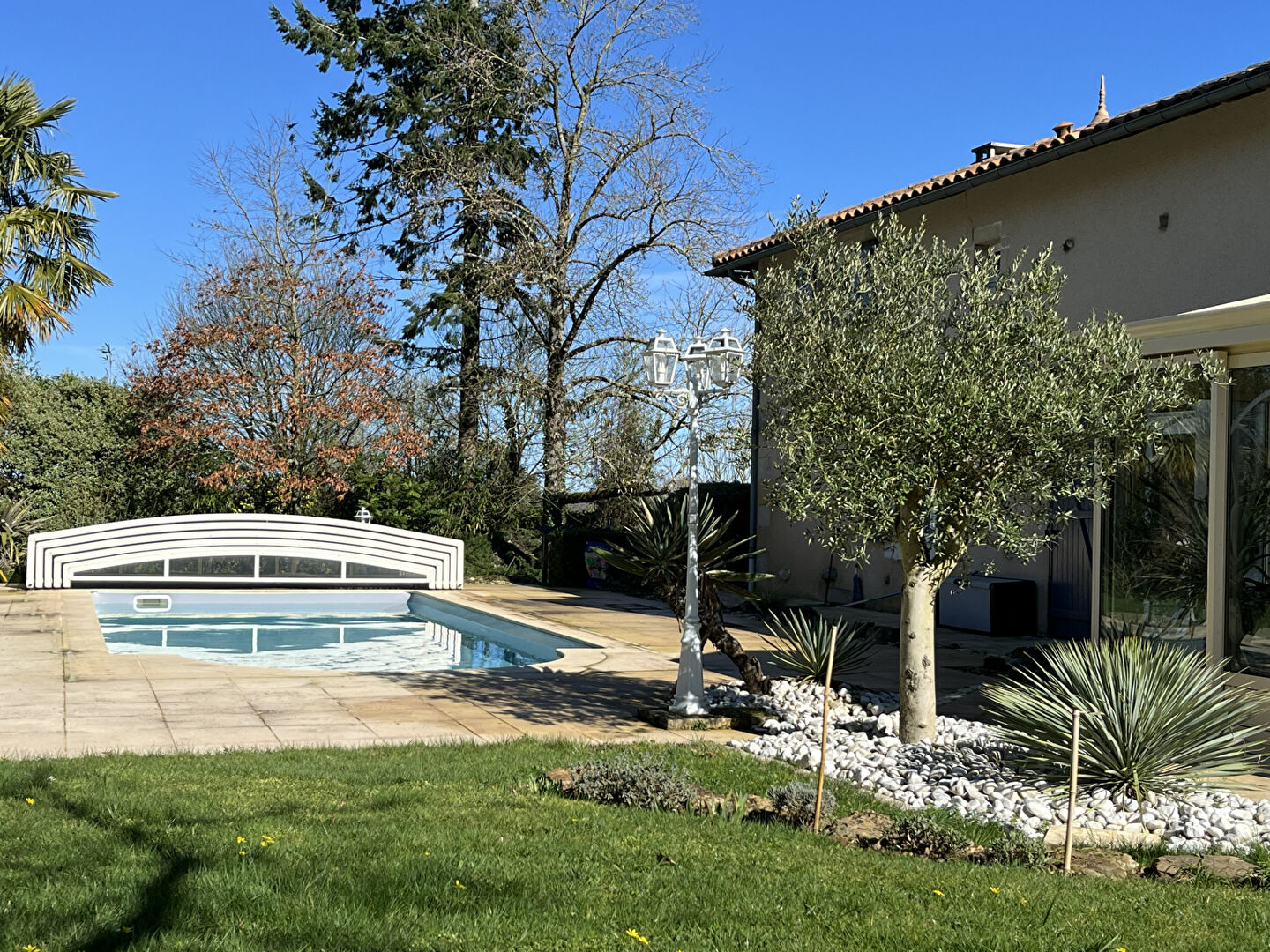 Piscine couverte (amovible) et chauffée avec pompe à chaleur.