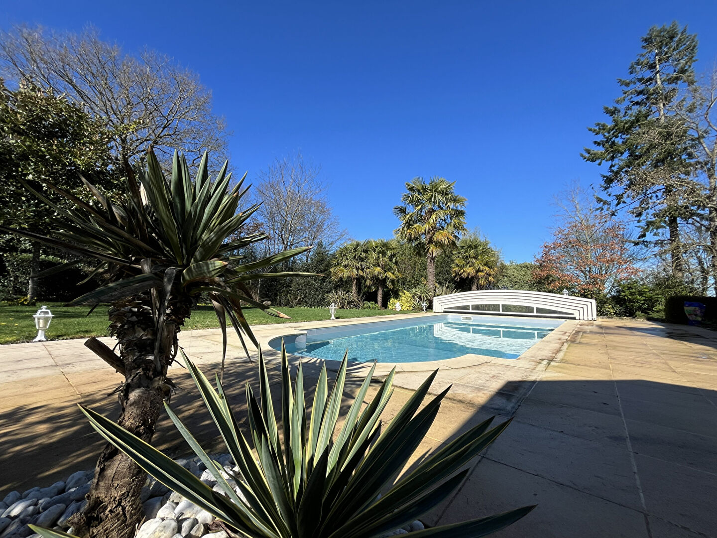 * Grande terrasse, piscine 9.5x4 maçonnée, liner de 2022, pompe de déc2025, (système électrolyse) - local technique à la cave sous le salon de la maison.
