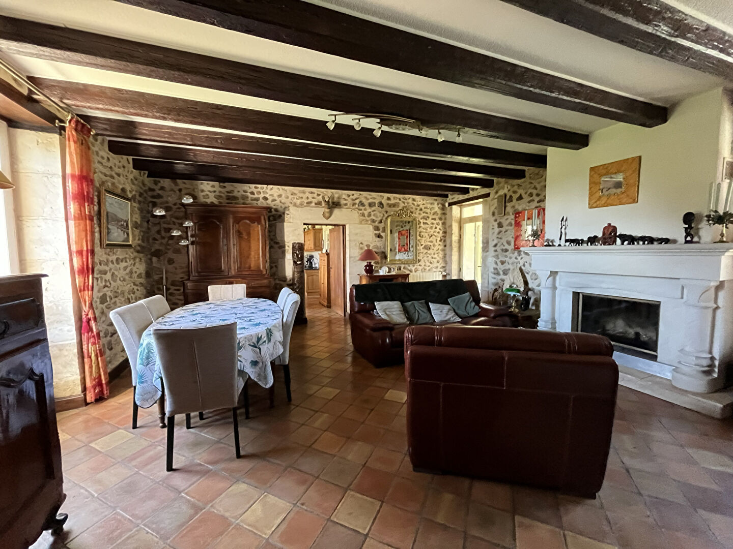 - salon-séjour avec insert et pierres apparentes sur véranda chauffée,