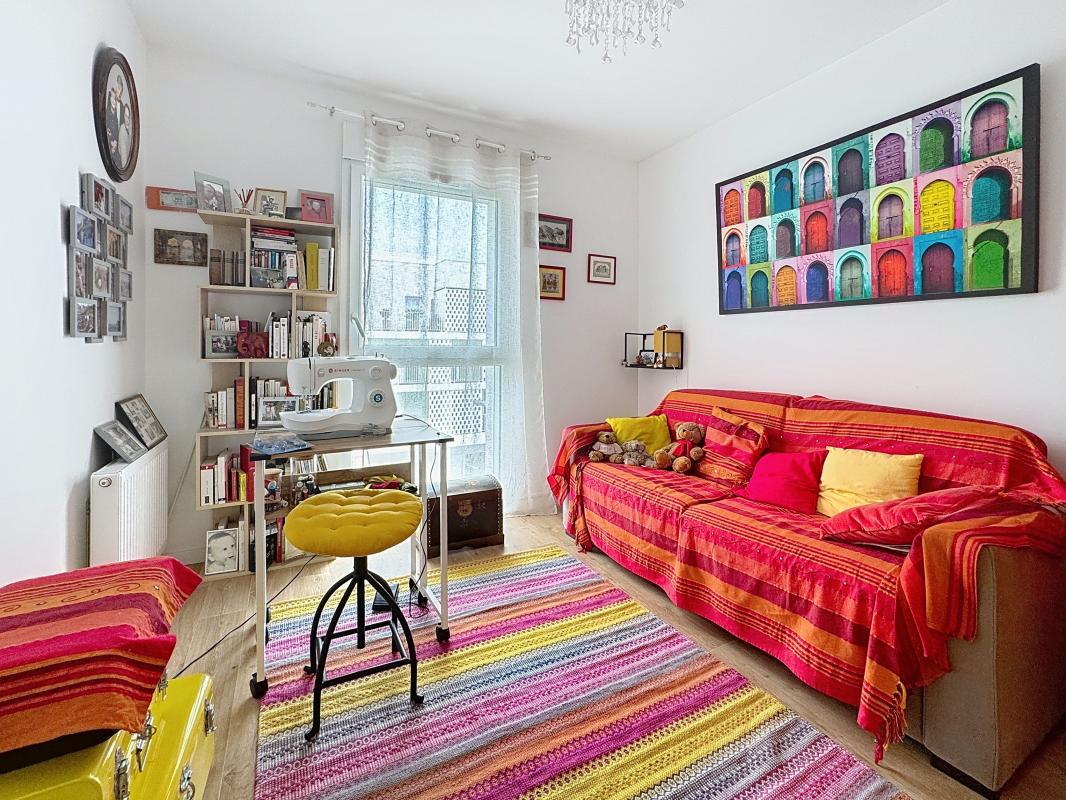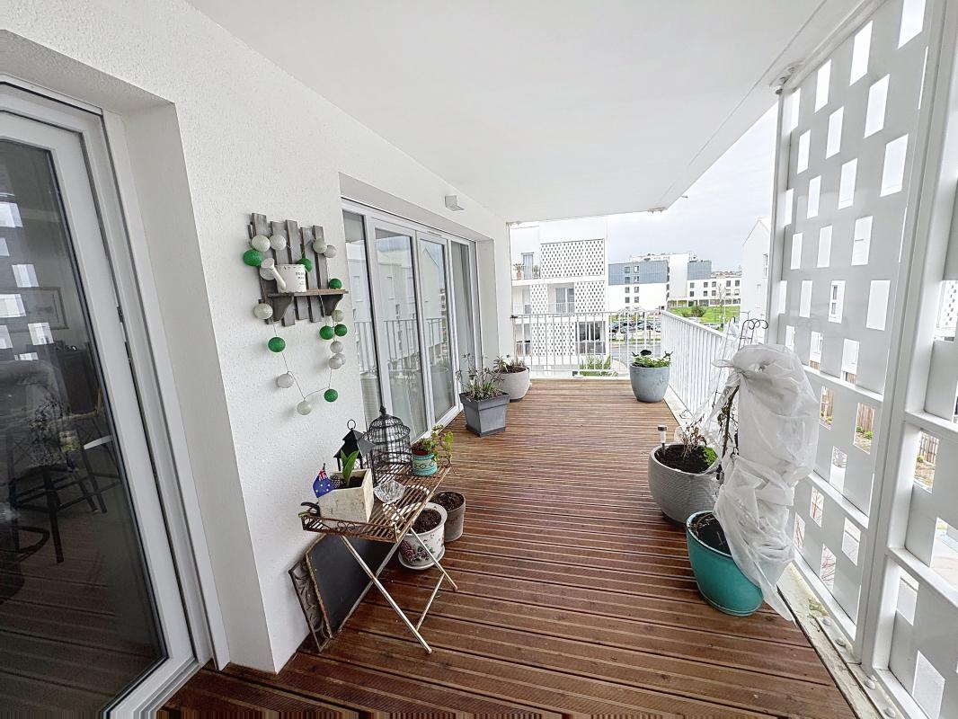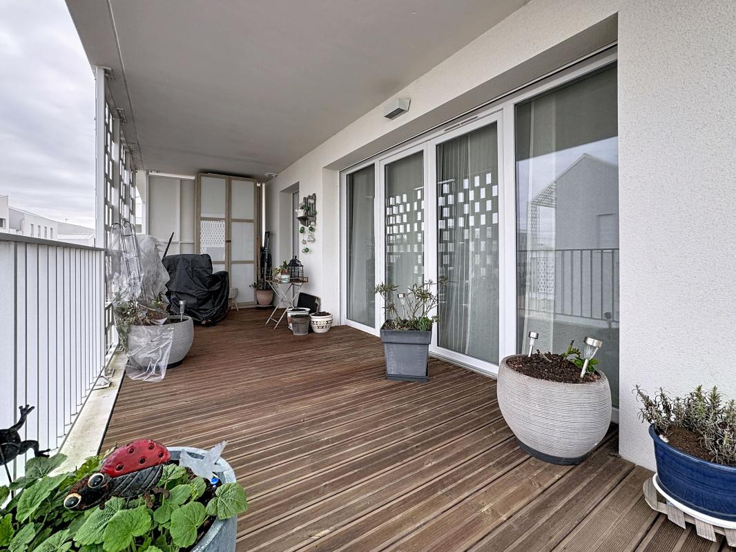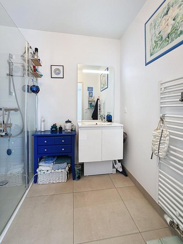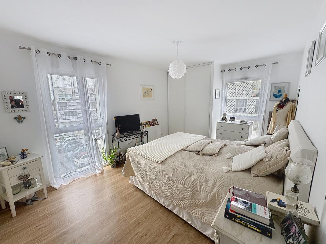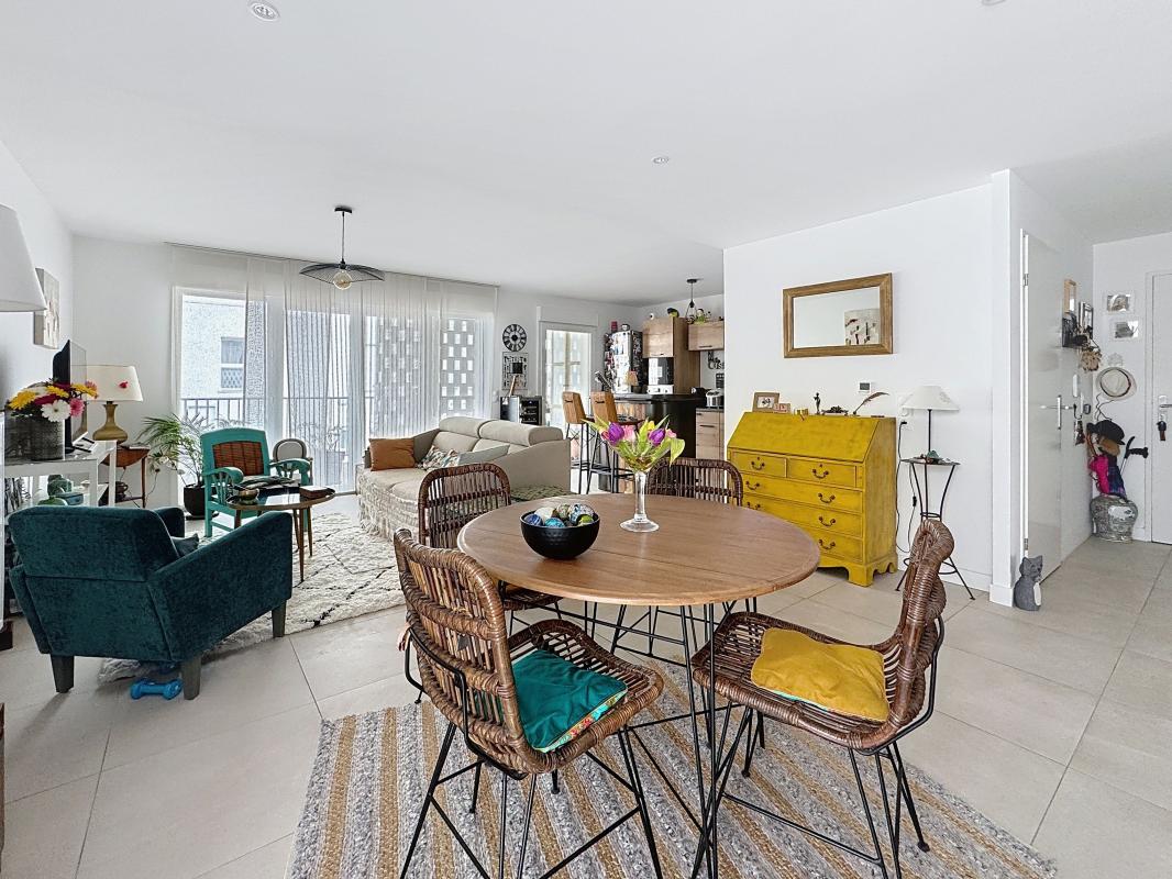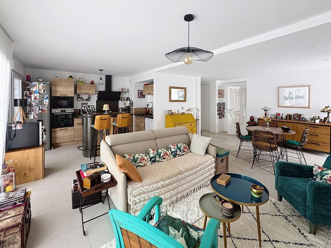 L'appartement se compose d'une entrée avec placard, d'un vaste séjour lumineux ouvrant sur une terrasse de plus de 14.69 m², d'une cuisine ouverte équipée, d'un cellier, et d'un palier desservant deux chambres. La chambre principale dispose de sa propre salle d'eau avec WC, une seconde salle d'eau et un wc séparé complètent l'ensemble. De nombreux placards viennent optimiser les rangements.