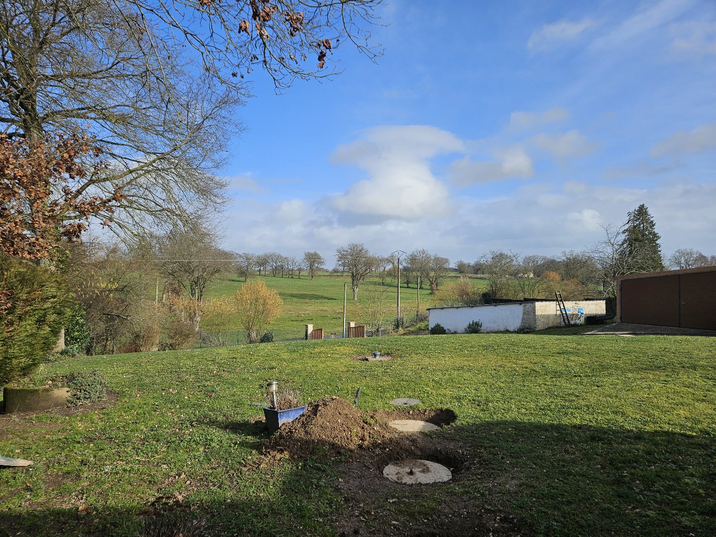 À l'extérieur, la propriété est accessible par un portail électrique et bénéficie d'un jardin à l'avant et à l'arrière, offrant d'agréables espaces de détente. Un appentis attenant à la maison abrite la cuve à fioul. Le grand garage comprend un puits, des panneaux solaires installés en toiture ainsi que des alarmes sur les portes. Un second grand garage, un abri ouvert, un bassin et une piscine hors-sol viennent compléter l'ensemble. Cette configuration conviendrait parfaitement à une petite entreprise ou à un passionné souhaitant stocker ou entretenir une collection de véhicules.
