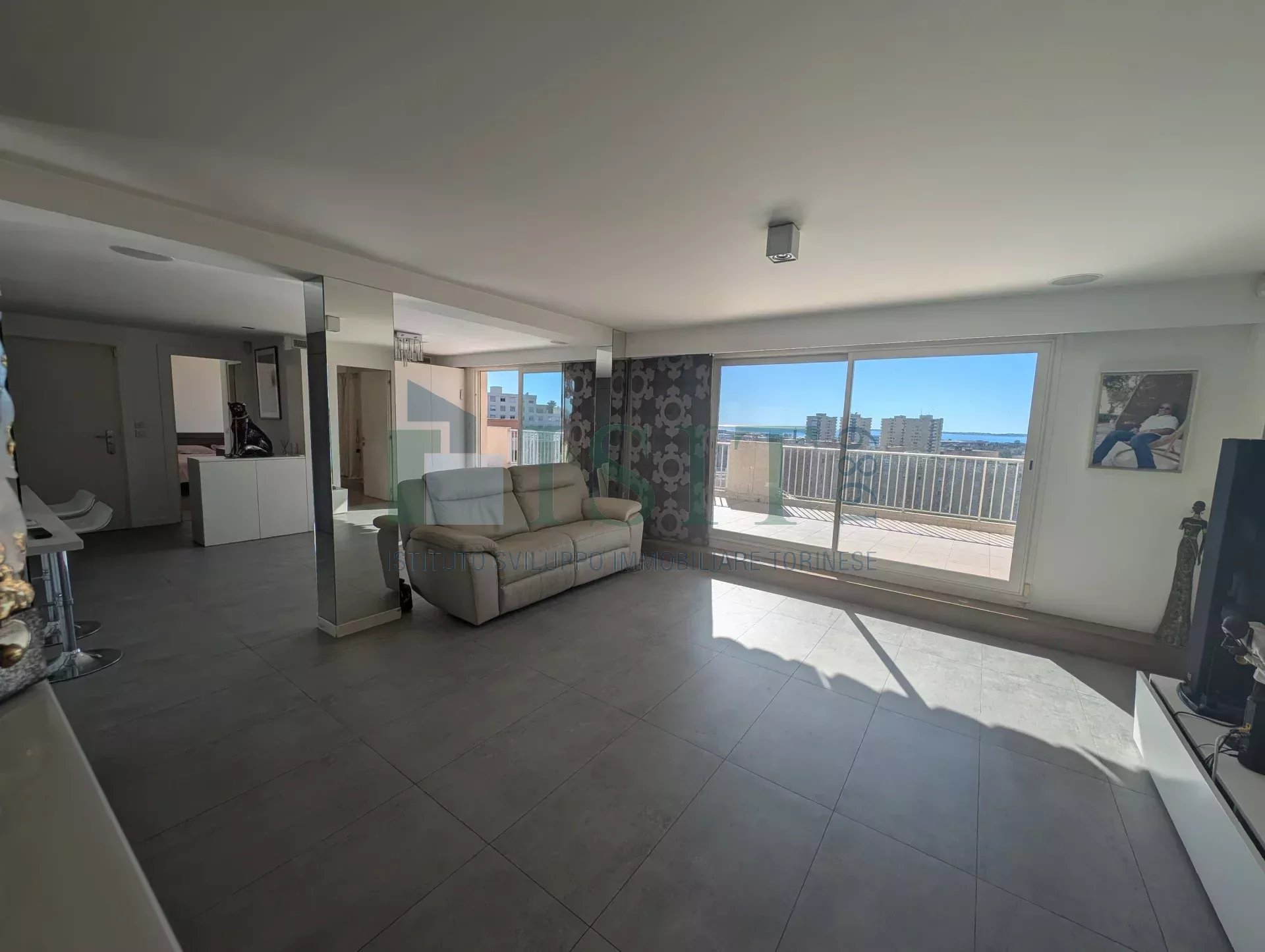 À l’extérieur, vous profiterez d’une terrasse circulaire de plus de 300 m² offrant une vue panoramique imprenable sur les montagnes, la mer et la ville. Une véranda, actuellement aménagée en salle de sport, complète cet espace et offre un confort supplémentaire tout au long de l’année. Véritable espace de vie à ciel ouvert, cette terrasse permet de profiter pleinement du climat niçois et de recevoir en toute convivialité.