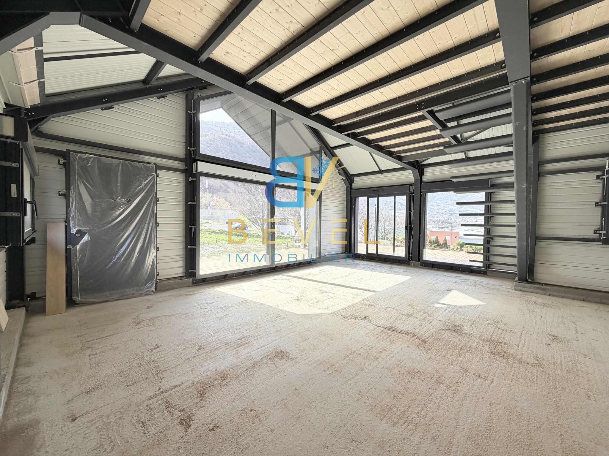 À l'intérieur, la maison offre des volumes remarquables, notamment grâce à un séjour avec plafond cathédrale qui accentue la sensation d'espace et de lumière. Les grandes ouvertures permettent de profiter pleinement de la vue sur la vallée et les montagnes environnantes. Une mezzanine surplombant la pièce de vie offre de nombreuses possibilités d'aménagement : espace bureau, coin lecture, chambre supplémentaire ou espace détente selon les envies des futurs propriétaires.