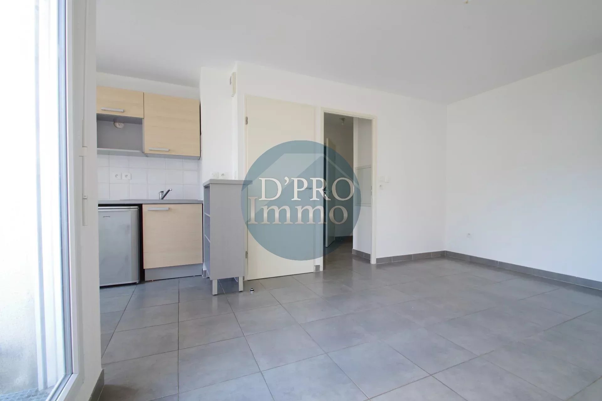 L’appartement se compose d’une entrée avec placard, d’une pièce de vie lumineuse exposée sud-ouest donnant sur un balcon, avec séjour ouvert sur une cuisine aménagée et équipée de meubles hauts et bas, plaque de cuisson, hotte et réfrigérateur.