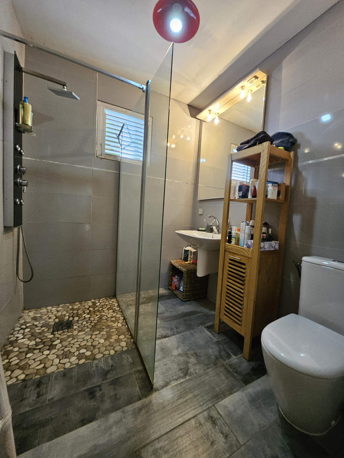 La villa principale, construite sur deux niveaux, développe une surface habitable d'environ 113 m2. Elle comprend un salon, une cuisine, trois chambres dont deux climatisées et une aménagée en mezzanine, une salle d'eau avec WC et une salle de bain avec WC. Une grande terrasse couverte en L d'environ 65 m2 prolonge les espaces de vie vers l'extérieur.