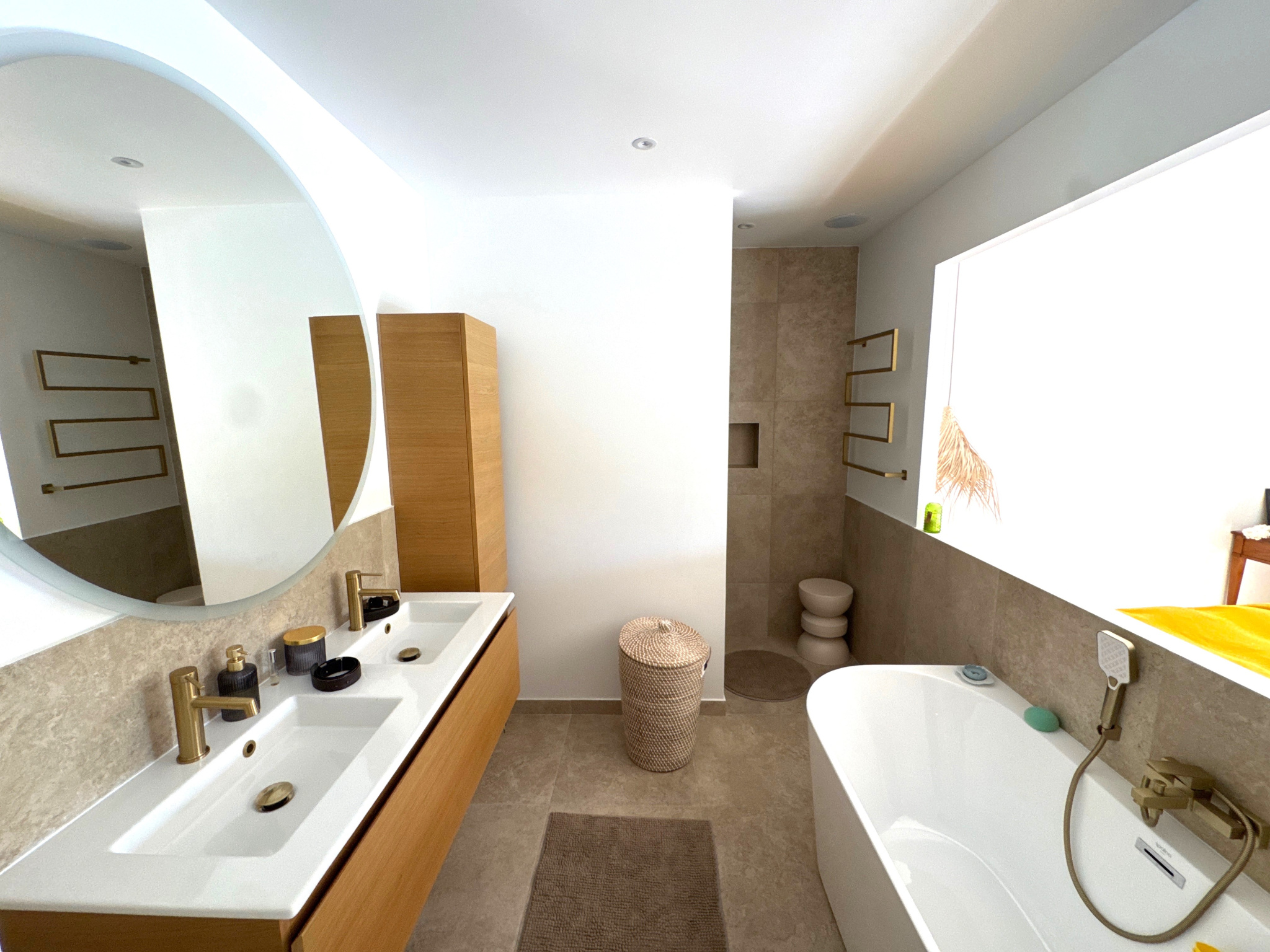 A L'extérieur, Piscine chauffée à débordement (10x5), filtration au sel, avec pool house équipé (BBQ, four à pizza, lave-vaisselle...) et une grande terrasse en bois.