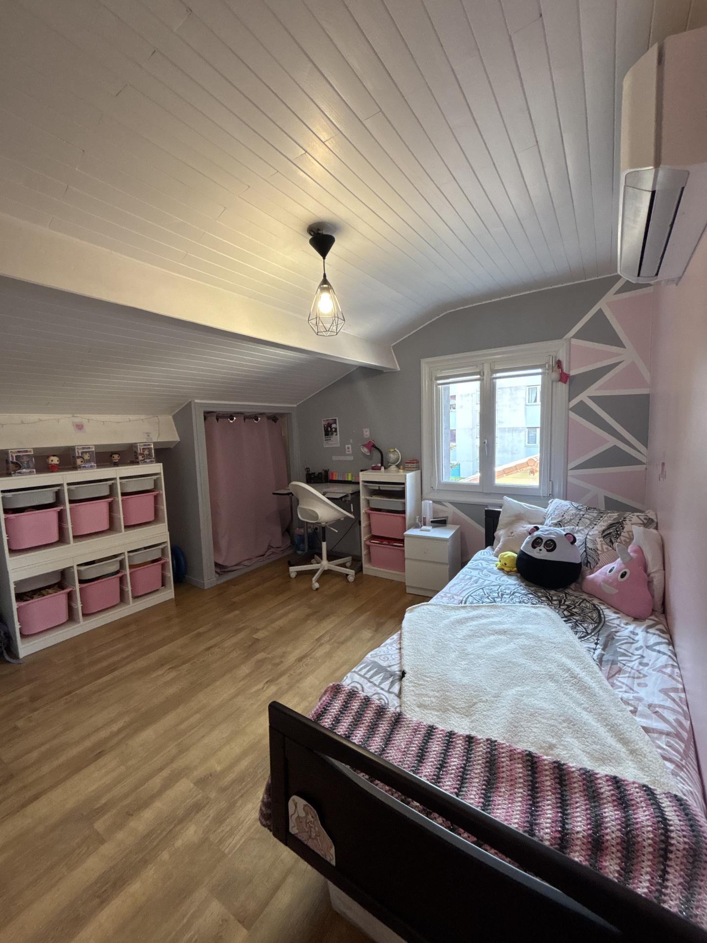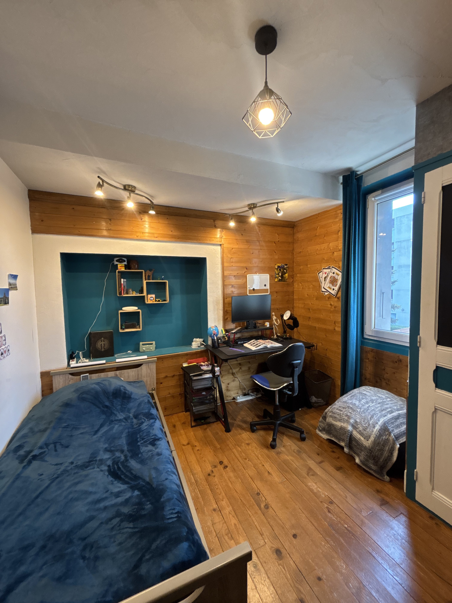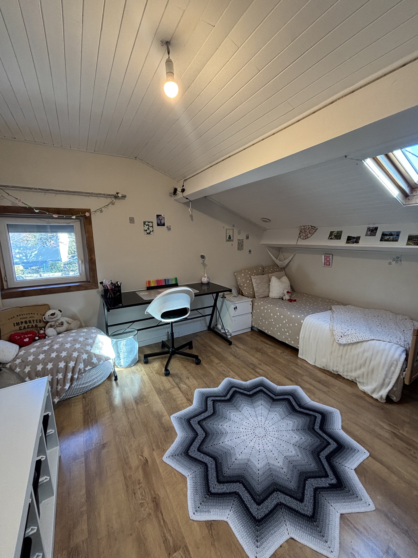 À l'étage, trois chambres et un bureau composent le territoire des enfants, des projets, du télétravail. Les beaux planchers d'époque craquent légèrement (c'est mon langage à moi), la hauteur sous plafond donne de l'air aux idées. On s'y sent à la fois protégé et libre.