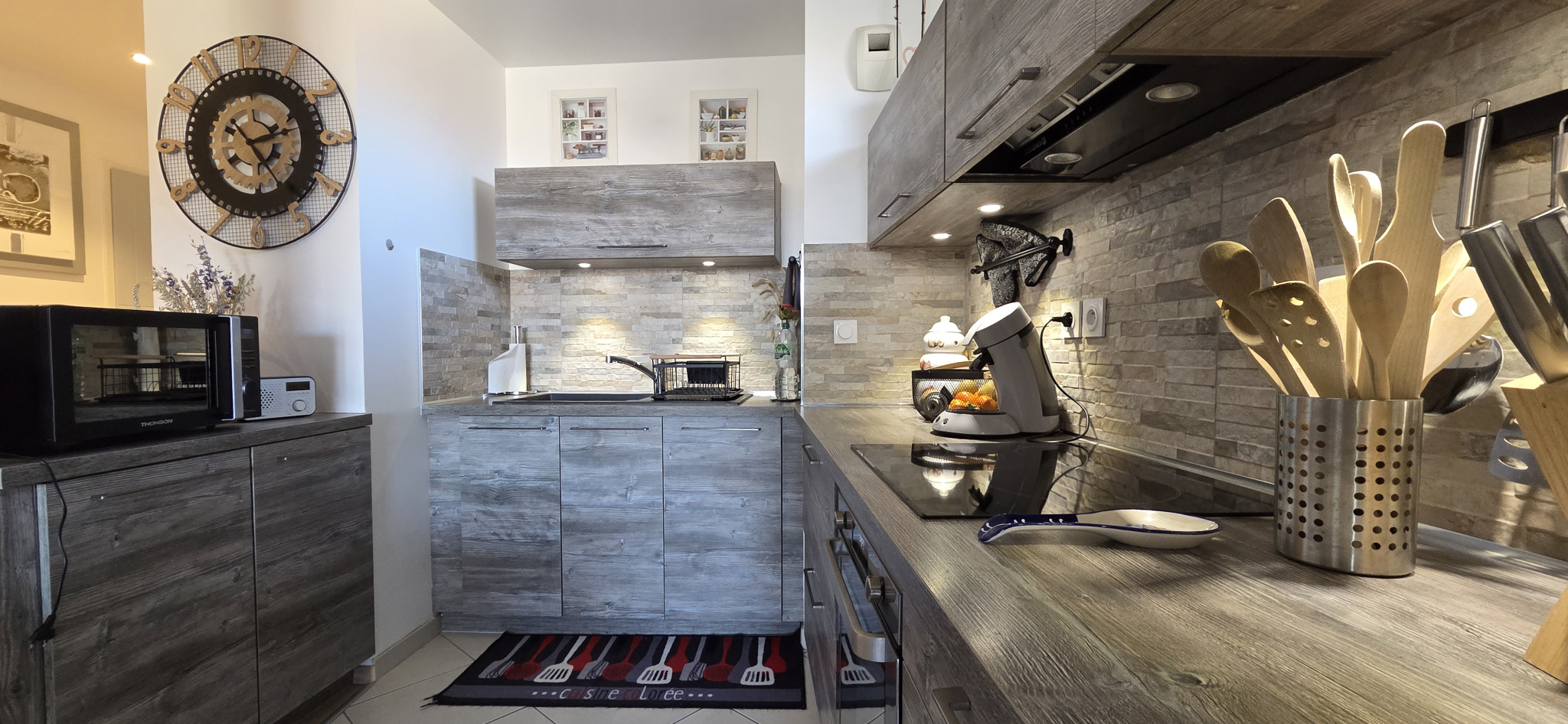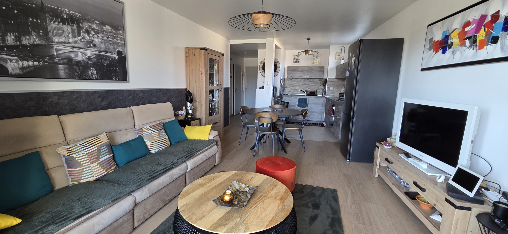 L'appartement est traversant EST/OUEST et bénéficie d'un séjour donnant sur une terrasse sans vis à vis de 7m2 et en fond une cuisine ouverte entièrement équipée.