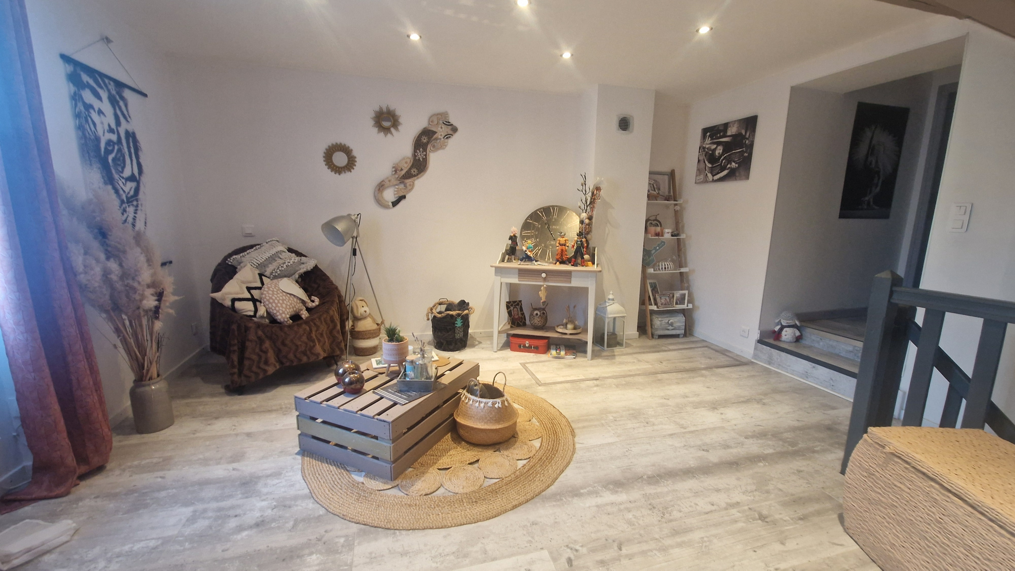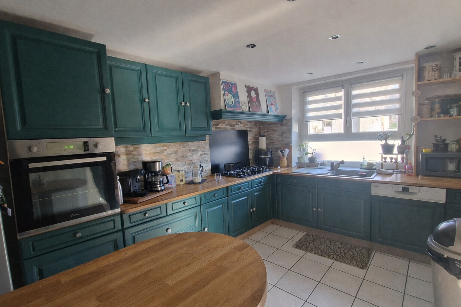 Au rez-de-chaussée, vous découvrirez une belle pièce de vie chaleureuse avec cheminée, ainsi qu'une cuisine équipée de 14 m2, fonctionnelle et conviviale.