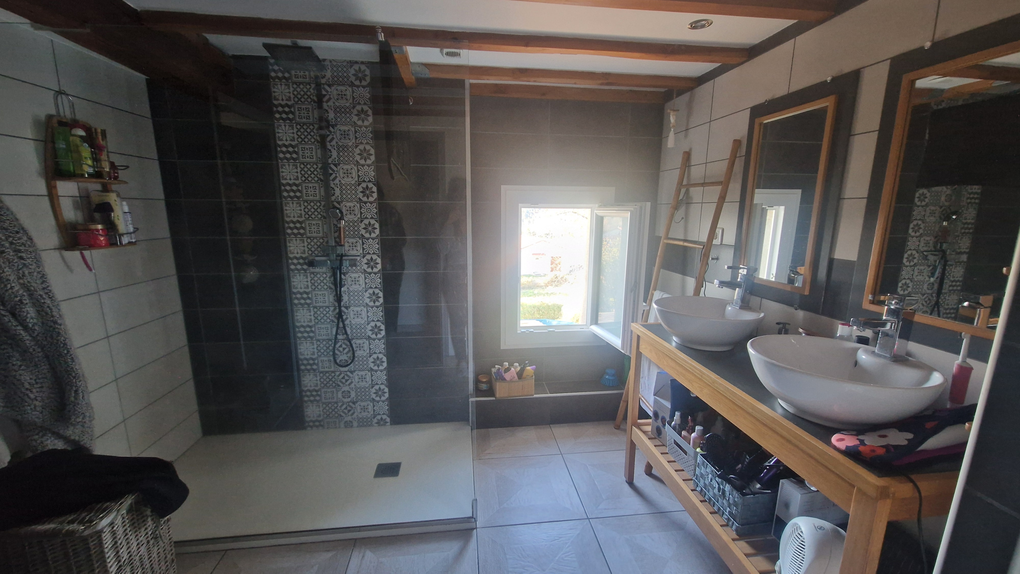 Un bel escalier en chêne mène au premier étage, qui dessert un spacieux palier de 18 m2 pouvant facilement accueillir un bureau ou une salle de jeux ; une première chambre, un WC indépendant, une salle d'eau moderne avec douche à l'italienne, ainsi qu'une pièce actuellement dédiée au ballon d'eau chaude.
