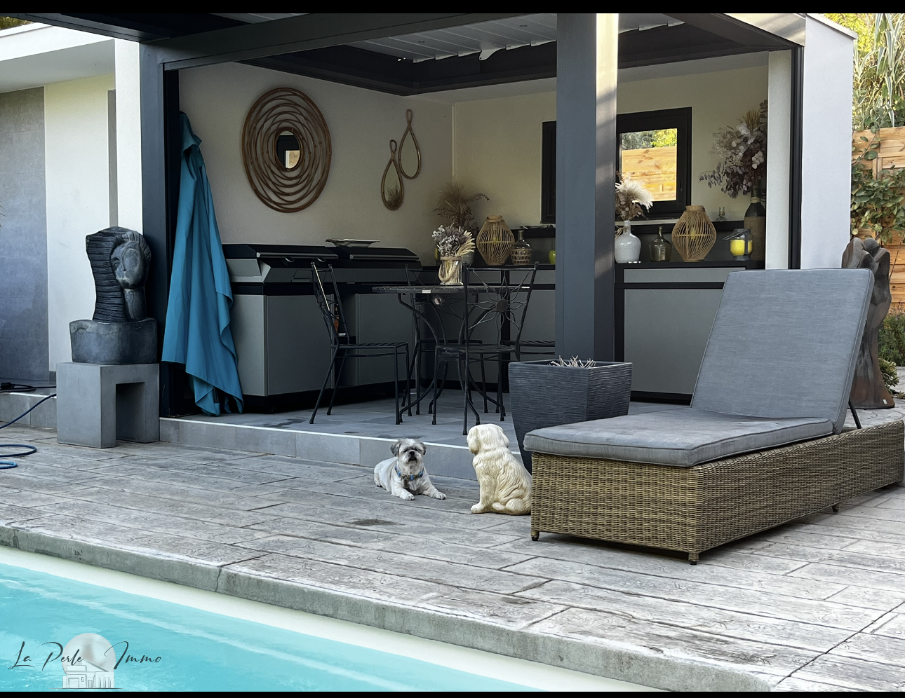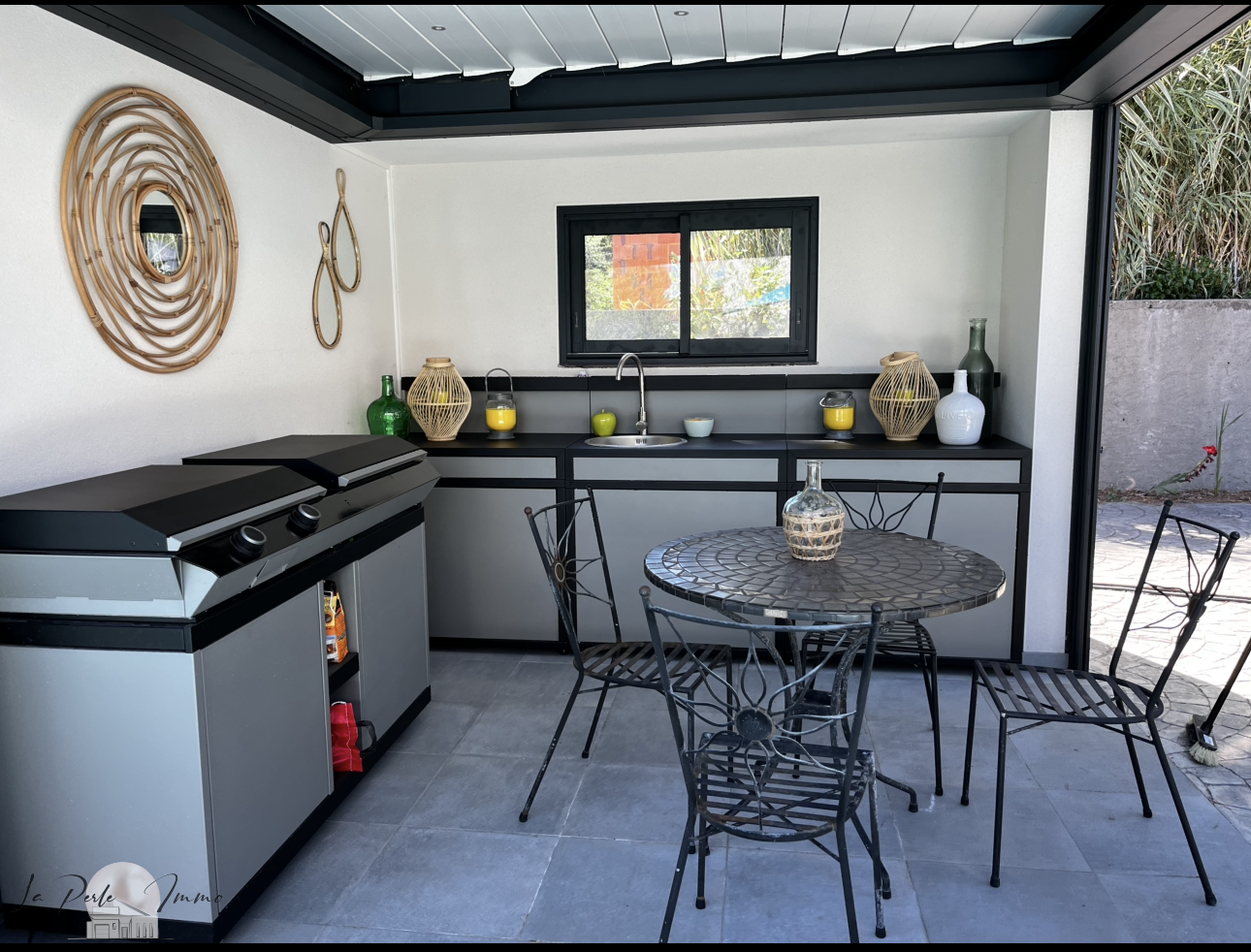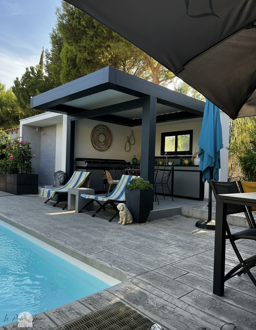 Cuisine d'été entièrement équipée sous pergola bioclimatique, avec matériel de qualité Forge Adour,