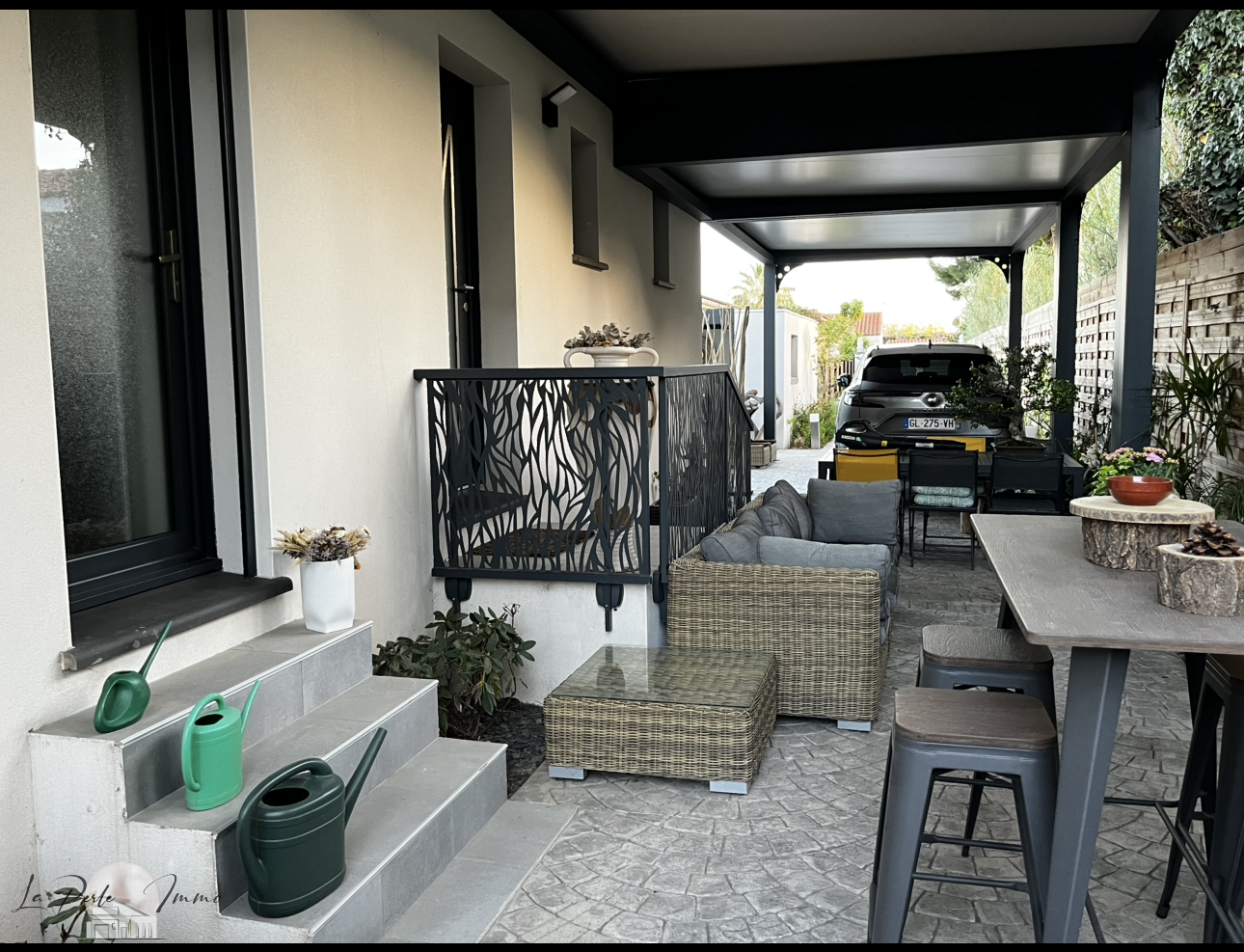 Dès l'arrivée, la propriété séduit par une vaste allée permettant d'accueillir plusieurs véhicules ou un camping-car, dont une partie est abritée sous carport.
