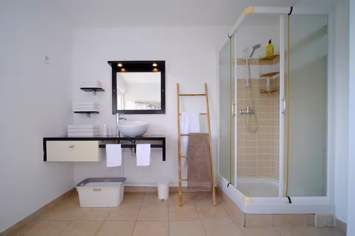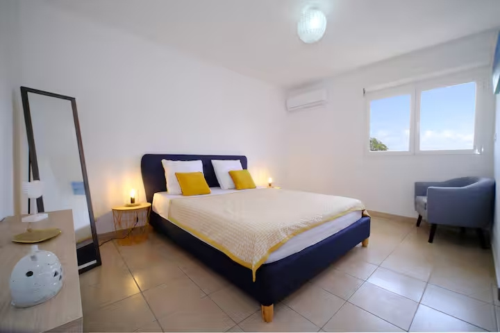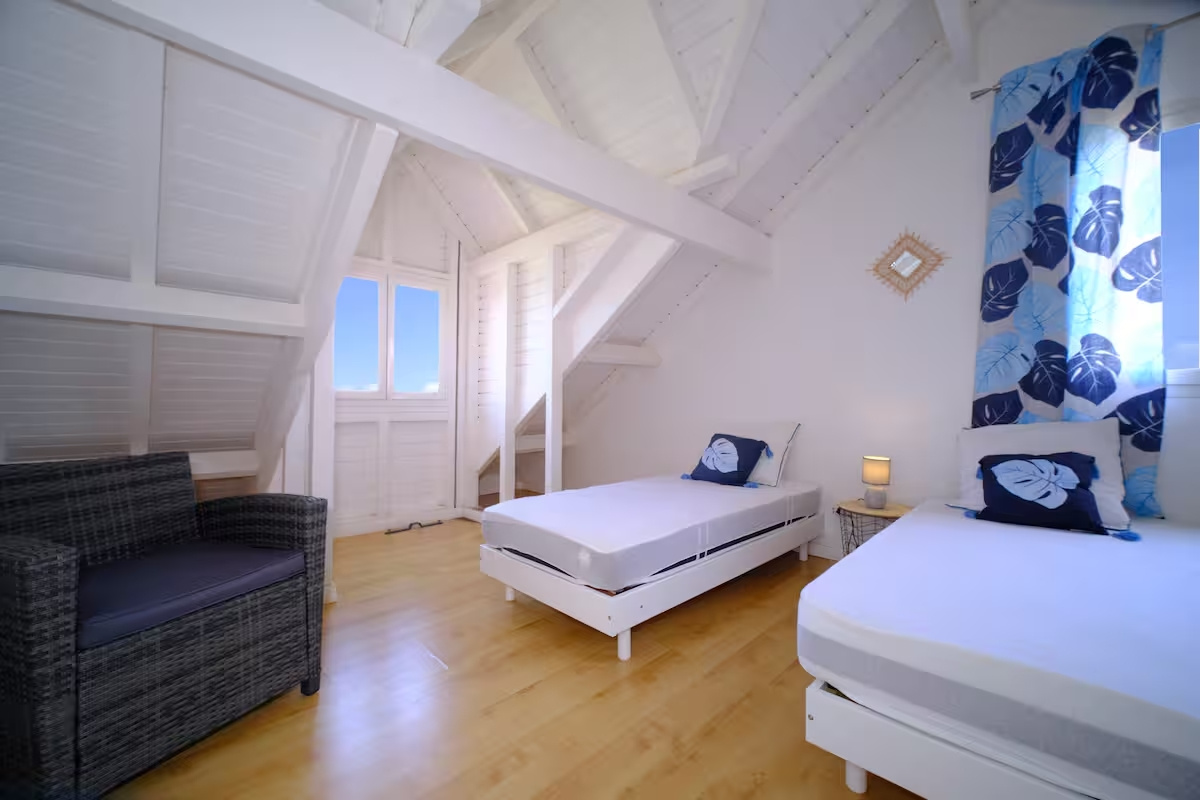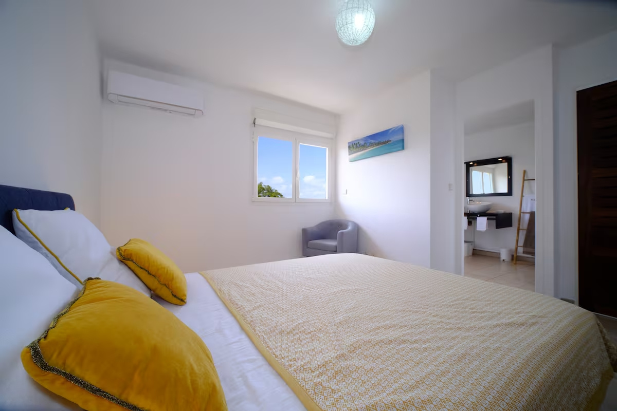 Au 1er niveau, une belle chambre avec sa salle d'eau attenante, un grand séjour, une cuisine ouverte sur une belle terrasse vue mer.