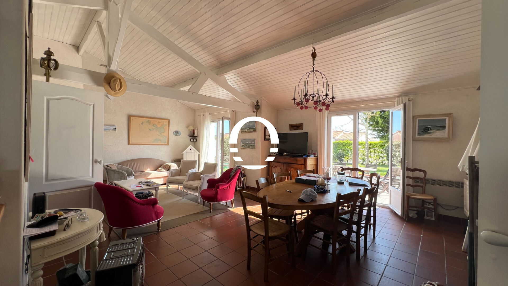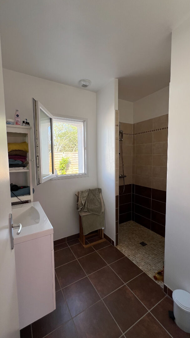 Belle pièce de vie lumineuse exposée sud avec plafond cathédrale et cheminée ouverte, cuisine ouverte aménagée et équipée, dégagement avec placard, 4 chambres avec placards, salle de bains, WC indépendant, cellier et douche retour de plage. Terrasse sud.